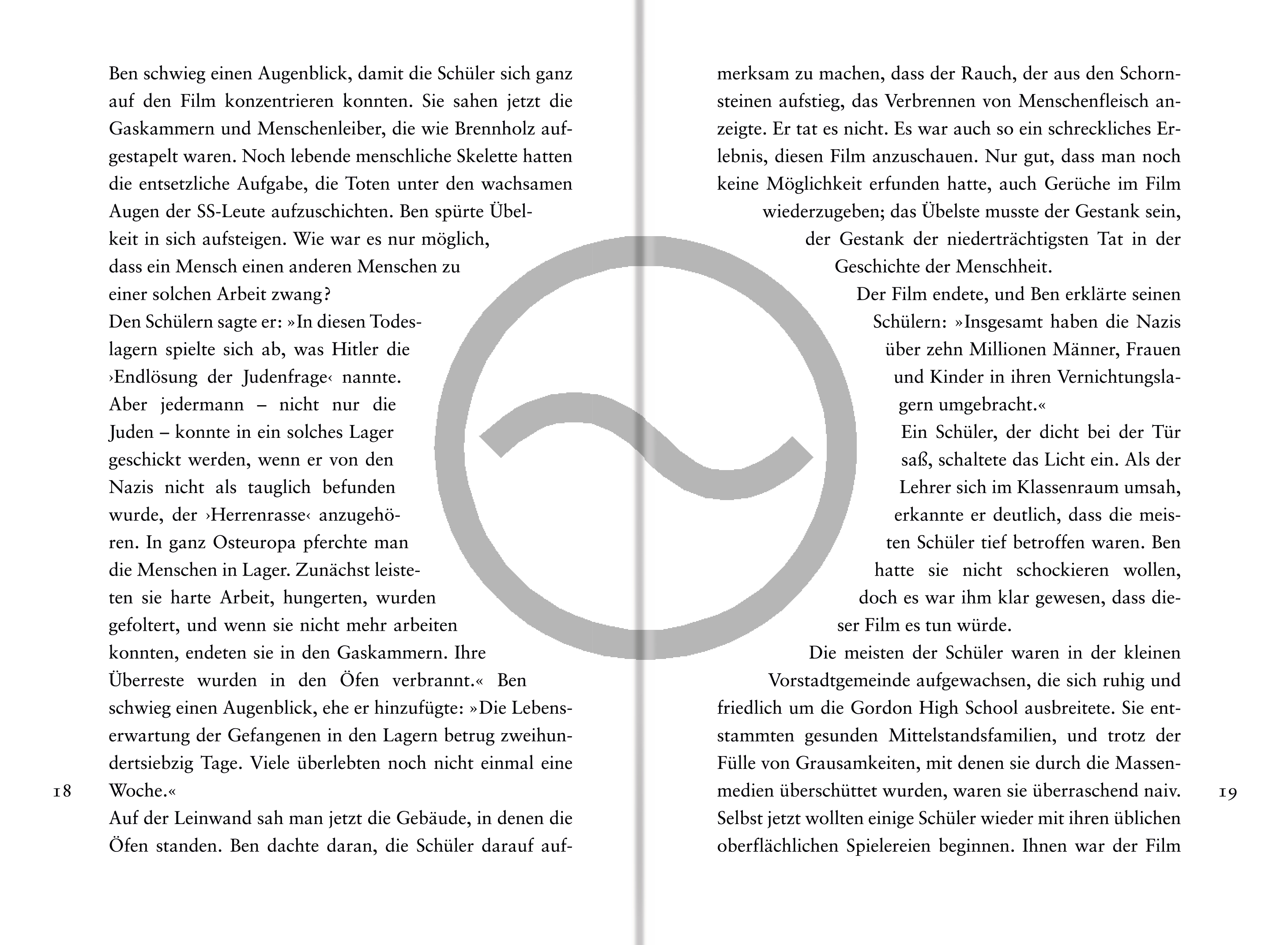 | Schlagworte | ab 14 Jahren • Antolin (ab 7. Klasse) • Ausgrenzung • Beschäftigung • Buch • Bücher • Demokratie • Diktatur • Drittes Reich • Experiment • Faschismus; Kinder-/Jugendliteratur • Führer • für Jungen • für Kinder • für Mädchen • gegen Rechts • Geschenk • Geschenkidee • Gruppen-Druck • Hitler • Hitler-Jugend • Jugend-Buch • Lehrer • Lesen • Literatur • Macht • Materialien für Unterrichtsgestaltung • Nationalsozialismus • Nazi • Neofaschismus • Neo-Faschismus • Preis der Leseratten des ZDF • Propaganda • Radikalisierung • Rechtsextremismus • Rechtsradikalismus • Rechts-Radikalismus • Schule • Schüler • Schullektüre • Unterdrückung • Unterrichts-Material • Zeitgeschichte • Zeit-Geschichte • Zweiter Weltkrieg |