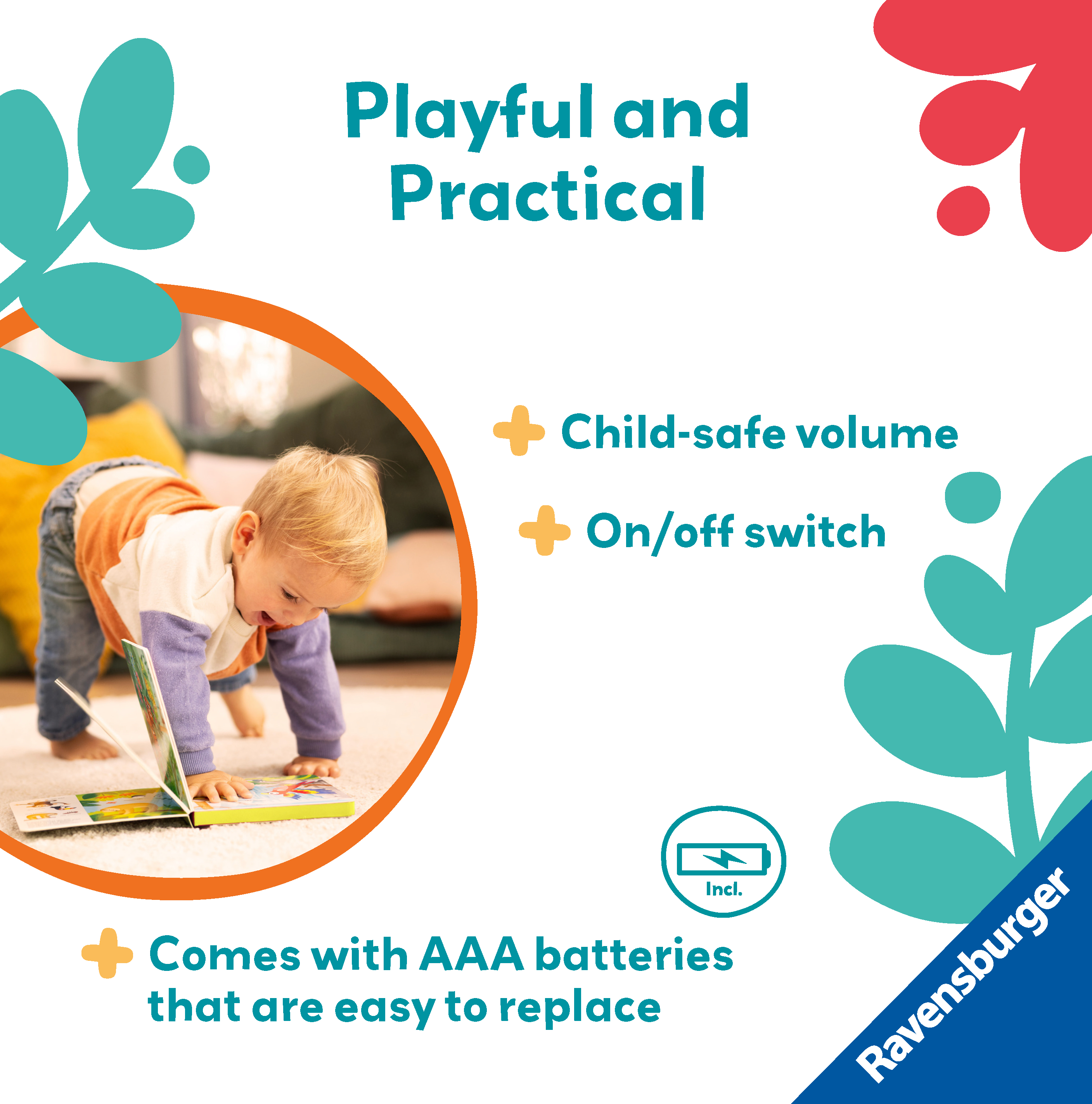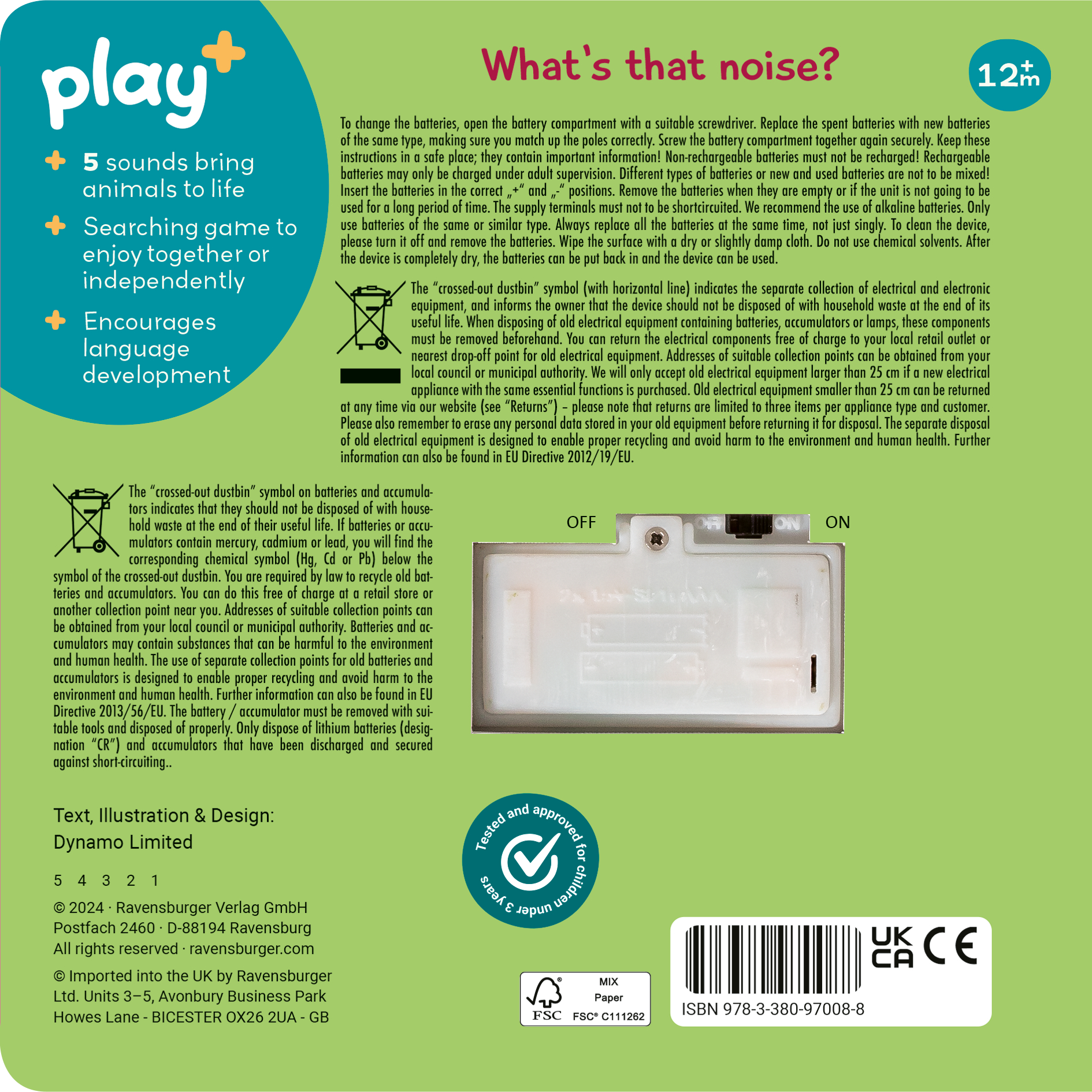 Who’s making that loud noise? Where is the tiger hiding? This search and find sound book is packed with animals to find. As you explore the jungle in this 12-page baby book, children will love to press the buttons to hear the five different animal sounds. Shh…Who’s There? Jungle Animals is a great addition to story time together, or a fun activity for independent play and discovery. About Play+ It all starts with play! A child's capacity to play is unlimited—and it's a good thing, too! The more your child plays, the more aware they become about how things work—sparking fun, discovery, and learning! The Play+ collection from Ravensburger encompasses a wide range of toys and books for babies and toddlers aged 0 to 36 months. With playful discovery at its heart, the collection has been designed keeping children and parents in mind - offering captivating fun and developmental benefits with practical touches for ease of use and added play value. Whether it's time for a story, teething time, an anytime playtime, or you're simply on-the-go together, Play+ toys and books are designed to encourage your child's natural curiosity and foster early milestones. Developed alongside experts and incorporating over 100 years of Ravensburger expertise in making high quality toys.