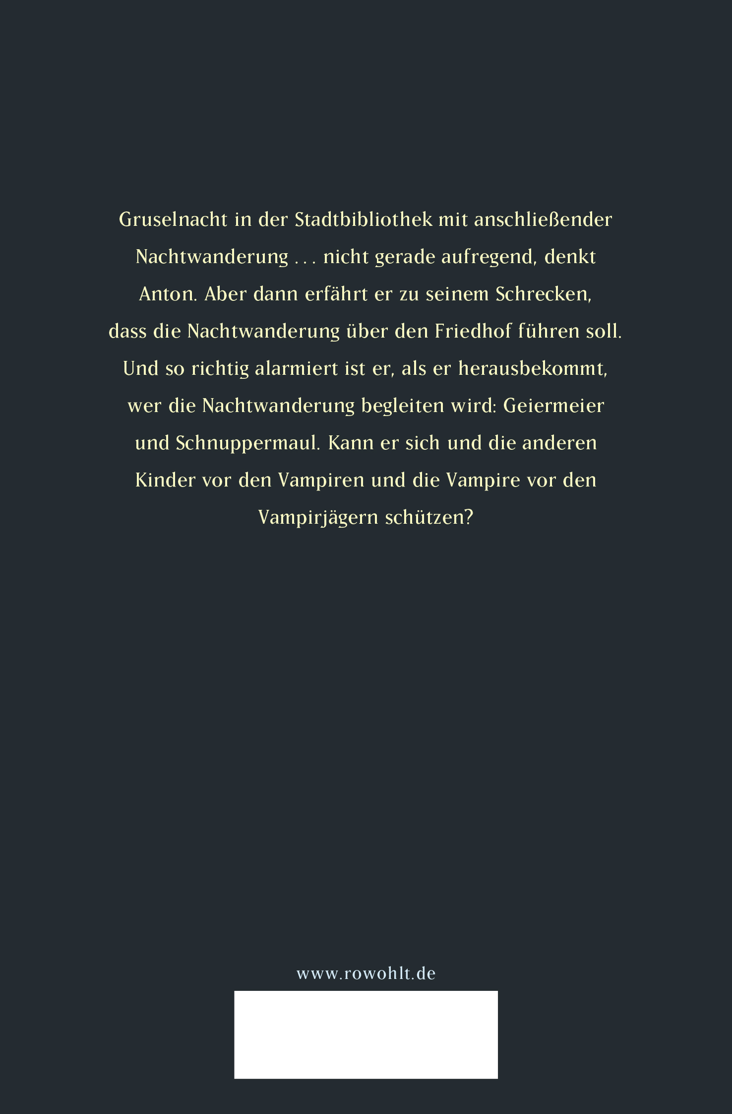 Gruselnacht in der Stadtbibliothek mit anschließender Nachtwanderung . . . nicht gerade aufregend, denkt Anton. Aber dann erfährt er zu seinem Schrecken,dass die Nachtwanderung über den Friedhof führen soll. Und so richtig alarmiert ist er, als er herausbekommt, wer die Nachtwanderung begleiten wird: Geiermeier und Schnuppermaul. Kann er sich und die anderen Kinder vor den Vampiren und die Vampire vor den Vampirjägern schützen?
