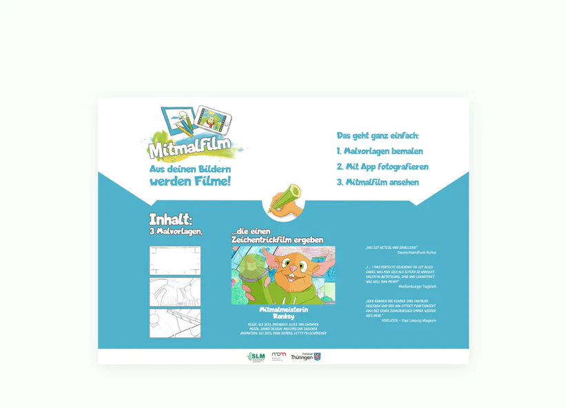 Bis zu drei Kinder können die Vorlagen mit Buntstiften bemalen. Jedes Bild ist unterschiedlich, aber alle sind gleich wichtig für das gemeinsame Erlebnis: Ein toller, lustiger Trickfilm mit der Streetart-Ratte Ranksy.