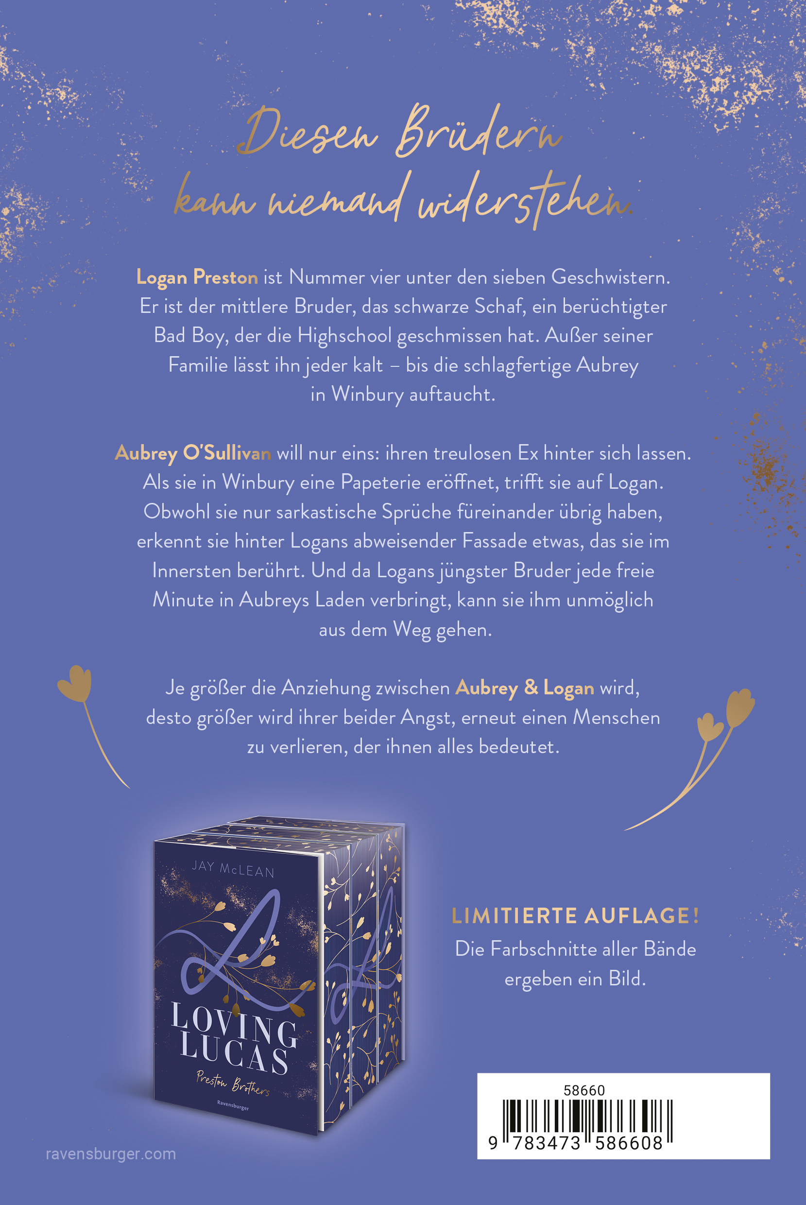 *** Limitierte Auflage mit farbigem Buchschnitt! Nur solange der Vorrat reicht! *** LOGAN PRESTON ist Nummer vier unter den Geschwistern. Er ist der mittlere Bruder, das schwarze Schaf, ein berüchtigter Bad Boy. Als AUBREY O‘SULLIVAN in Winbury eine Papeterie eröffnet, trifft sie auf Logan. Obwohl sie nur sarkastische Sprüche füreinander übrig haben, erkennt sie hinter Logans abweisender Fassade etwas, das sie im Innersten berührt. Und da sein jüngster Bruder jede freie Minute in Aubreys Laden verbringt, kann sie Logan unmöglich aus dem Weg gehen. Sexy, berührend, herzzerreißend: die New Adult Romances von Jay McLean! Preston-Brothers-Trilogie Loving Lucas Losing Logan Leaving Leo First & Forever-Dilogie Be My First Be My Forever