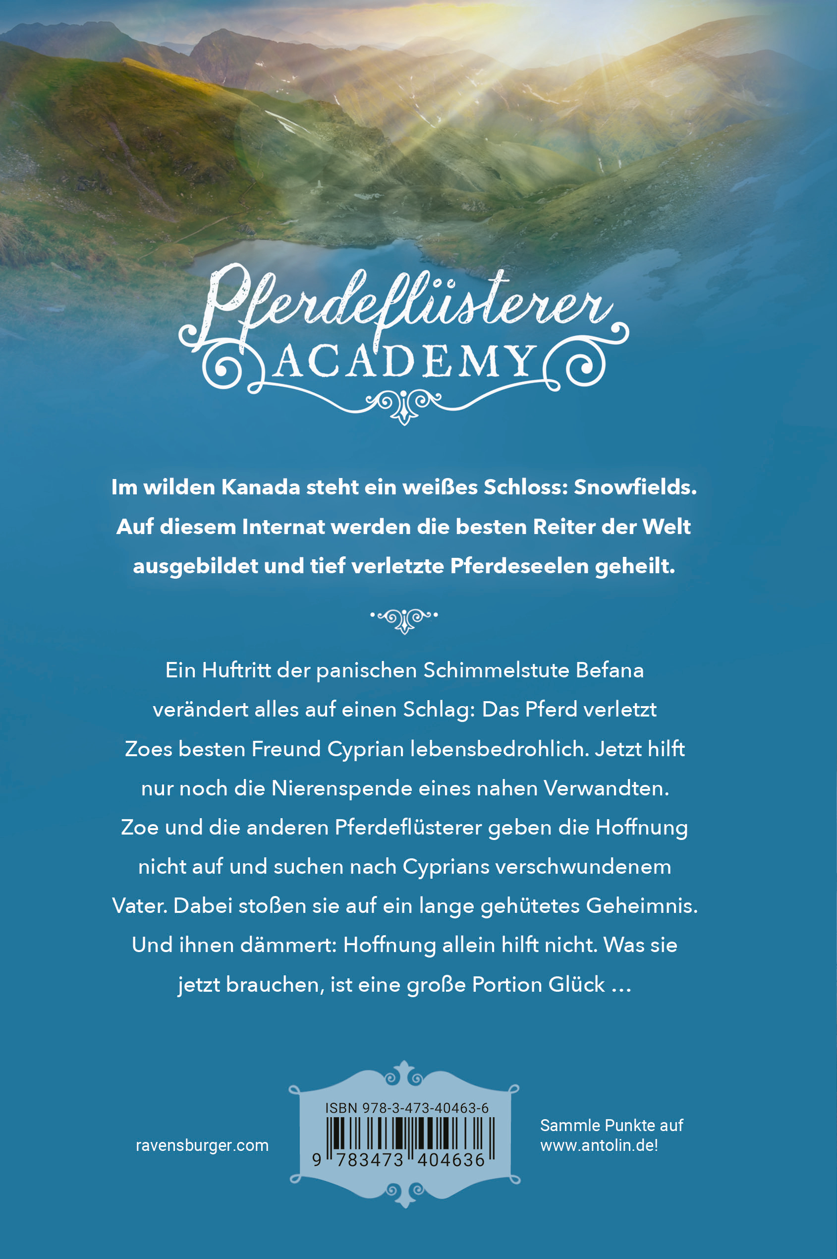 Im wilden Kanada steht ein weißes Schloss: Snowfields. Auf dem Internat werden die weltbesten Reiter ausgebildet und verletzte Pferdeseelen geheilt. Ein Huftritt der panischen Schimmelstute Befana verändert alles auf einen Schlag: Das Pferd verletzt Zoes besten Freund Cyprian lebensbedrohlich. Jetzt hilft nur noch die Nierenspende eines nahen Verwandten. Zoe und die anderen Pferdeflüsterer geben die Hoffnung nicht auf und suchen nach Cyprians verschwundenem Vater. Dabei stoßen sie auf ein lange gehütetes Geheimnis. Und ihnen dämmert: Hoffnung allein hilft nicht. Was sie jetzt brauchen, ist eine große Portion Glück … Entdecke alle Abenteuer in der „Pferdeflüsterer-Academy“: Band 1: Reise nach Snowfields Band 2: Ein geheimes Versprechen Band 3: Eine gefährliche Schönheit Band 4: Verletztes Vertrauen Band 5: Zerbrechliche Träume Band 6: Calypsos Fohlen Band 7: Flammendes Herz Band 8: Zoes größter Sieg Band 9: Cyprians Rückkehr Band 10: Die dunkle Wahrheit Band 11: Verborgene Gefühle Band 12: Wild und verwundbar Band 13: Taminos Entführung Band 14: Glück und Hoffnung