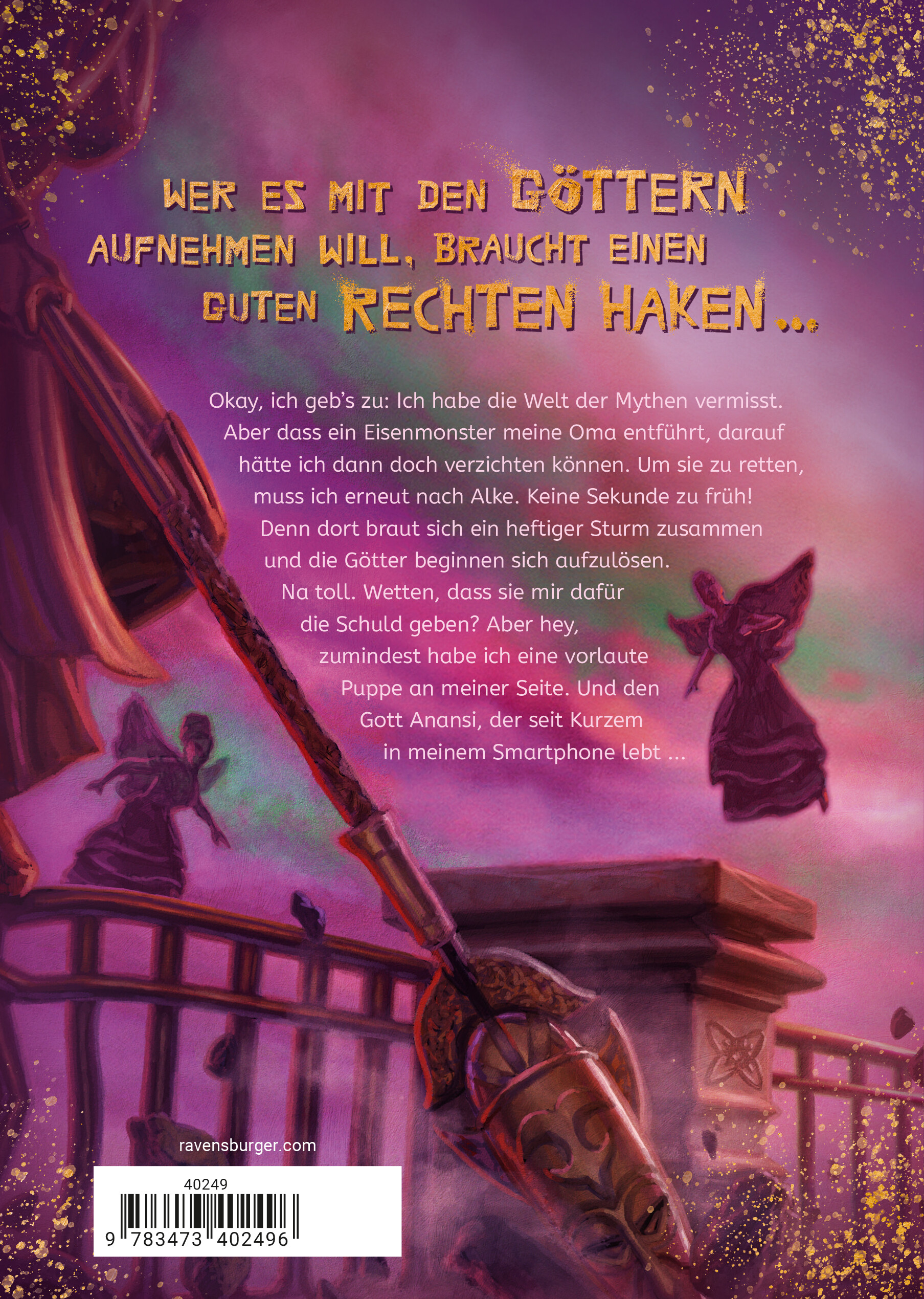 Wer es mit den Göttern aufnehmen will, braucht einen guten rechten Haken Okay, ich geb’s zu: Ich habe die Welt der Mythen vermisst. Aber dass ein Eisenmonster meine Oma entführt, darauf hätte ich dann doch verzichten können. Um sie zu retten, muss ich erneut nach Alke. Keine Sekunde zu früh! Denn dort braut sich ein heftiger Sturm zusammen und die Götter beginnen sich aufzulösen. Na toll. Wetten, dass sie mir dafür die Schuld geben? Aber hey, zumindest habe ich eine vorlaute Puppe an meiner Seite. Und den Gott Anansi, der seit Kurzem in meinem Smartphone lebt … Persönlich empfohlen von "Percy Jackson"-Autor Rick Riordan! Entdecke alle mythologischen Abenteuer aus der Reihe "Rick Riordan Presents": "Tristan gegen die Götter" von Kwame Mbalia Band 1: Mythenweber Band 2 erscheint im Frühjahr 2025 Band 3 erscheint im Herbst 2025 "Zane gegen die Götter" von J. C. Cervantes Band 1: Sturmläufer Band 2: Feuerhüter Band 3: Schattenspringer "Ren gegen die Götter" von J. C. Cervantes Band 1: Nachtkönigin Band 2: Jaguarmagie "Sikander gegen die Götter" von Sarwat Chadda Band 1: Das Schwert des Schicksals Band 2: Der Zorn der Drachengöttin "Aru gegen die Götter" von Roshani Chokshi Band 1: Die Wächter des Himmelspalasts Band 2: Im Reich des Meeresfürsten Band 3: Das Geheimnis des Wunschbaums Band 4: Die Magie der goldenen Stadt Band 5: Der Trank der Unsterblichkeit