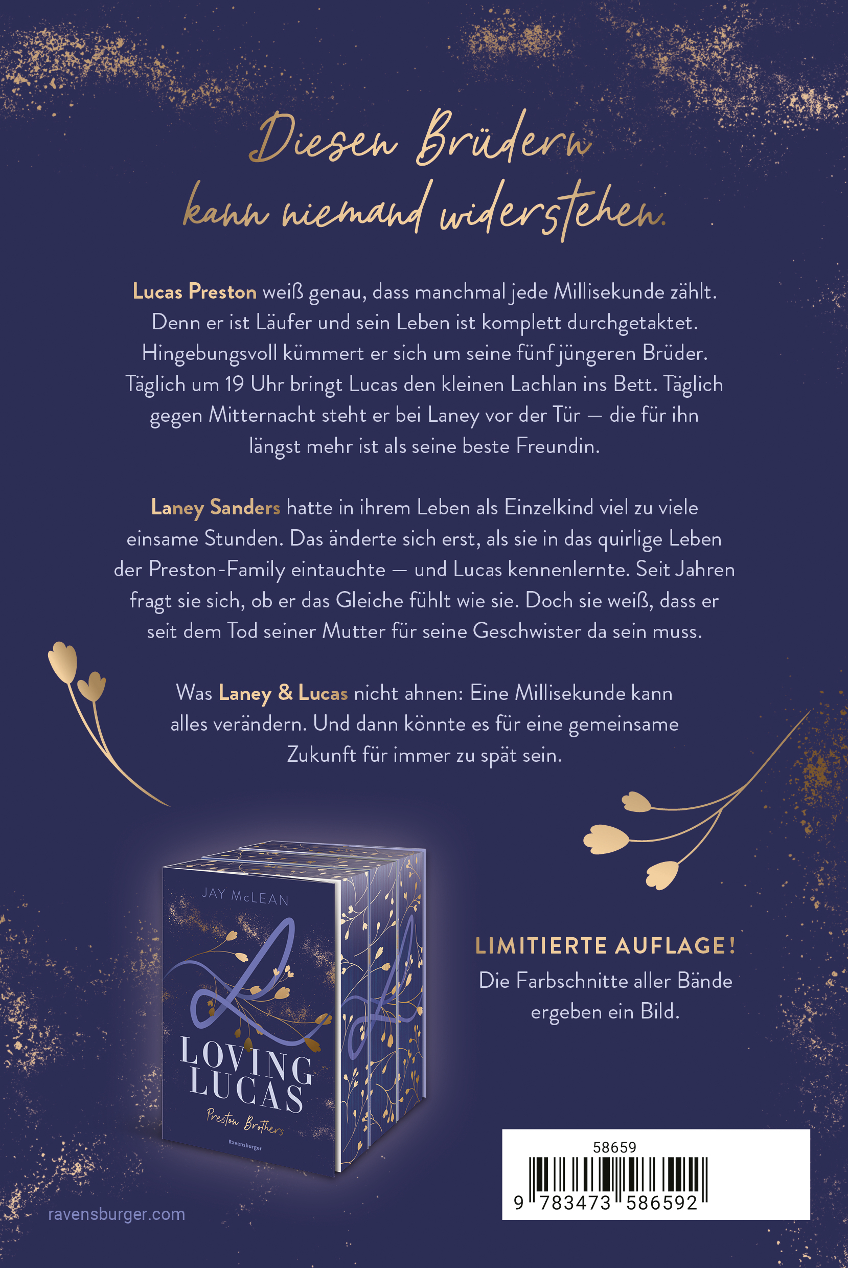 *** Limitierte Auflage mit farbigem Buchschnitt! Nur solange der Vorrat reicht! *** LUCAS PRESTON muss sich neben der Highschool um seine fünf jüngeren Brüder kümmern. Täglich um 19 Uhr bringt er den Jüngsten ins Bett. Täglich um Mitternacht klopft er bei Laney – die für ihn längst mehr ist als seine beste Freundin. LANEY SANDERS war ein einsames Einzelkind – bis sie in das Leben der Preston Family eintauchte und Lucas kennenlernte. Seit Jahren fragt sie sich, ob er dasselbe fühlt wie sie. Doch sie weiß, dass er seit dem Tod seiner Mutter für seine Geschwister da sein muss. Sexy, berührend, herzzerreißend: die New Adult Romances von Jay McLean! Preston-Brothers-Trilogie Loving Lucas Losing Logan Leaving Leo First & Forever-Dilogie Be My First Be My Forever