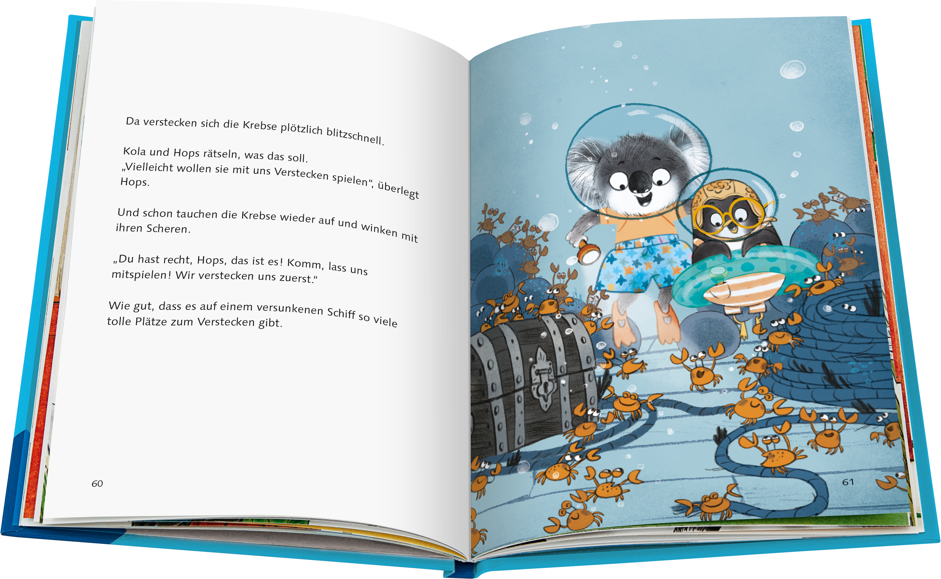 Bahn frei für Kola und Hops! Kola und Hops freuen sich auf einen Tag am Strand. Sie möchten im Meer planschen, Eis essen und Sandburgen bauen. Doch dann taucht Kapitän Ole mit seinem U-Boot auf. Er erzählt den beiden von einem versunkenen Schiff und einem echten Schatz. Wie aufregend! Klar, dass Kola und Hops ihn auf der Schatzsuche begleiten! Während der quirlige Koalabär Kola jeden Tag neue Ideen für aufregende Unternehmungen hat, würde sein bester Freund, der vorsichtige und vernünftige Pinguin Hops, es sich viel lieber in ihrem Baumhaus gemütlich machen. Doch weil sie beste Freunde sind, begleitet Hops Kola natürlich bei jedem Abenteuer, auch wenn es meist nicht lange dauert, bis sie aus Versehen in Schwierigkeiten geraten. Aber zusammen finden sie immer einen Ausweg. Ein einfacher Text und zahlreiche große Illustrationen erzählen mit viel Witz die Abenteuer der beiden Helden. Die Geschichten eignen sich nicht nur zum Vorlesen für Kindergarten- und Vorschulkinder, sondern auch zum ersten Selbst- oder Mitlesen.