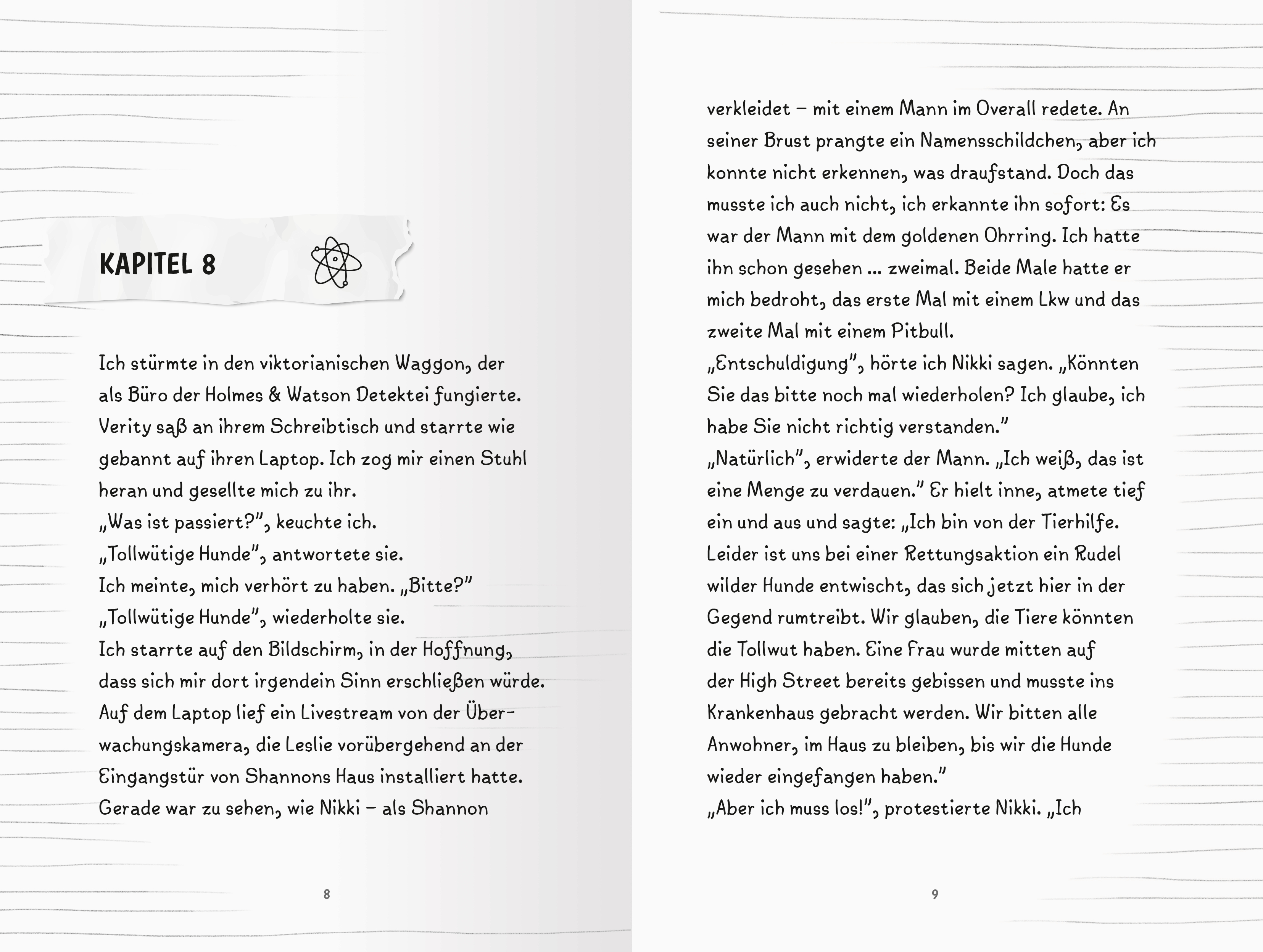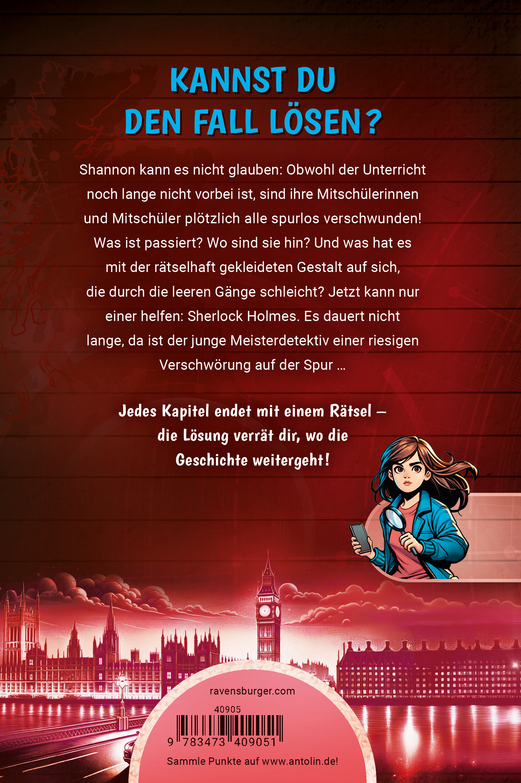 Kannst du das Rätsel lösen? Shannon kann es nicht glauben: Obwohl der Unterricht noch lange nicht vorbei ist, sind ihre Mitschülerinnen und Mitschüler plötzlich alle spurlos verschwunden! Was ist passiert? Wo sind sie hin? Und was hat es mit der rätselhaft gekleideten Gestalt auf sich, die durch die leeren Gänge schleicht? Jetzt kann nur einer helfen: Sherlock Holmes. Es dauert nicht lange, da ist der junge Meisterdetektiv einer riesigen Verschwörung auf der Spur … London, heute. Unerklärliche Dinge geschehen. Keiner glaubt dir – weder deine Eltern noch die Polizei. An wen kannst du dich wenden? An Sherlock Holmes natürlich! Der 12-jährige Sherlock steht seinem Vorfahren, dem berühmten Meisterdetektiv, in Sachen Verstand und Scharfsinn in Nichts nach. Gemeinsam mit seiner Freundin Verity Watson knackt er selbst die härteste Nuss. Unterstützung erhalten die beiden Spürnasen dabei von den Baker Street Irregulars – einigen intelligenten Elite-Schülern, die in einer alten verlassenen U-Bahn-Station ein hochmodernes Computerlabor eingerichtet haben und sich in jedes System hacken können. Seine Fälle schreibt Sherlock in seinem Krimi-Tagebuch auf – verschlüsselt natürlich. Kannst du den Code knacken? Band 1 erscheint im Herbst 2024 Band 2 erscheint im Frühjahr 2025 Band 3 erscheint im Herbst 2025 Band 4 erscheint im Frühjahr 2026
