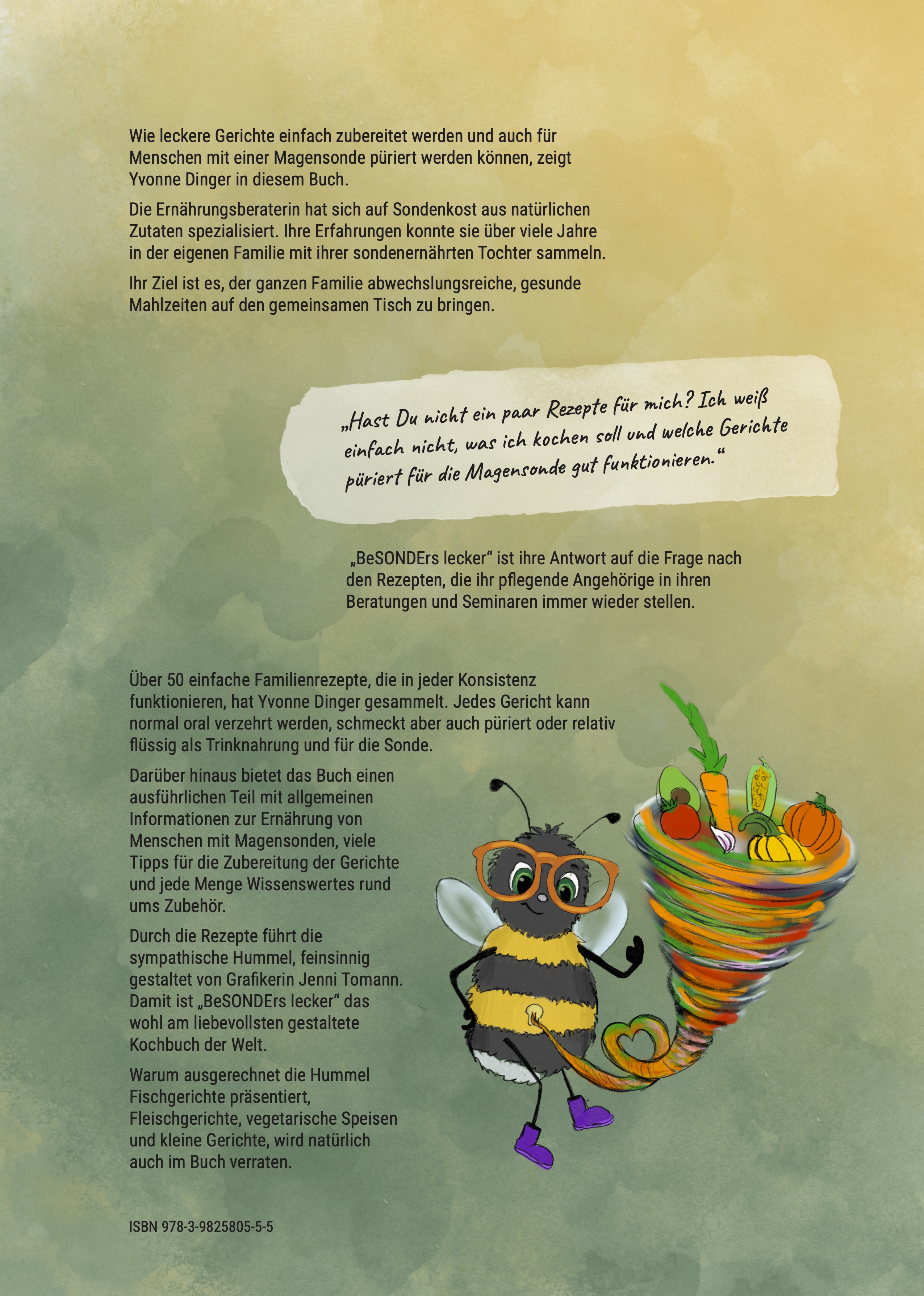 Durch die Rezepte, gewürzt mit einer großen Prise Humor und gespickt mit kleinen Anekdoten, führt die sympathische Hummel. „Hummel“ ist der Kosename von Yvonne Dingers Tochter. Feinsinnig und stets mit einem Augenzwinkern gestaltet wurde sie von Grafikerin Jenni Tomann. Damit ist „BeSONDErs lecker“ nicht nur ein einzigartiges, sondern das wohl am liebevollsten gestaltete Kochbuch der Welt.