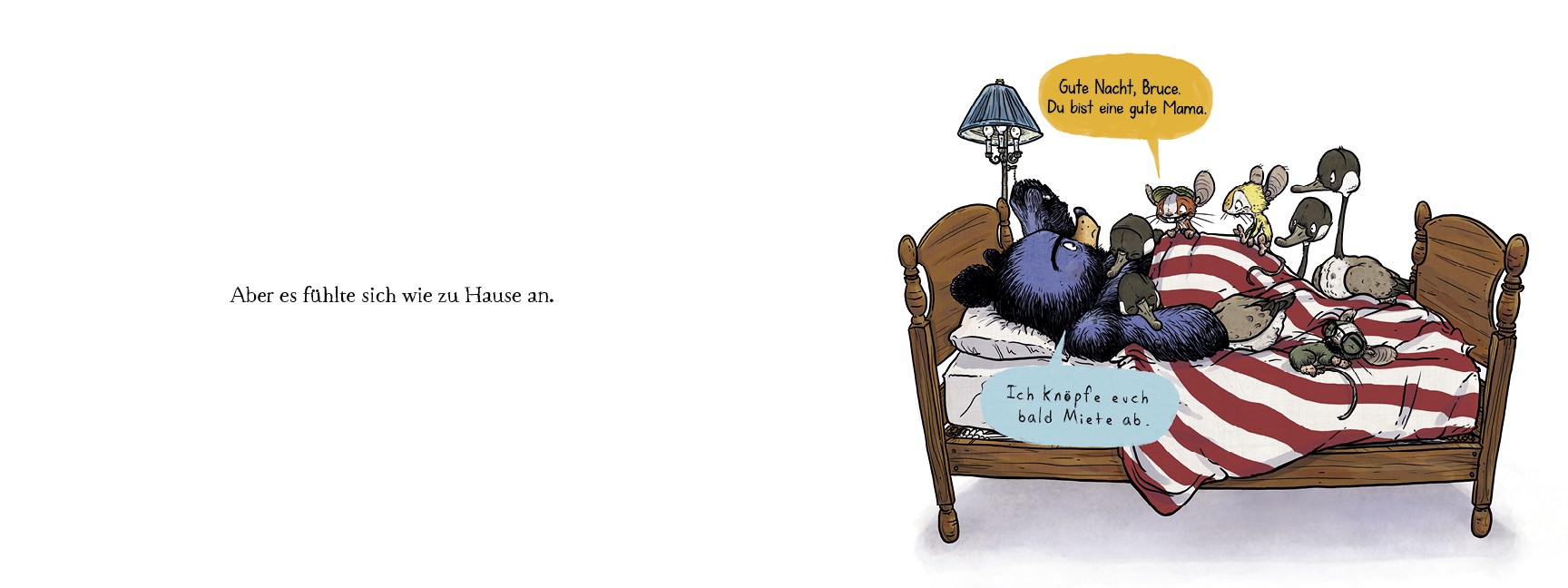 Bruce‘ Zuhause war perfekt – ein gemütliches Häuschen, gerade recht für den mürrischen Bären. Doch jetzt teilt er sein doch eher kleines Eigenheim nicht nur mit seinen vier Gänsekindern, sondern auch noch mit drei Mäusen, die sich einfach weigern auszuziehen.