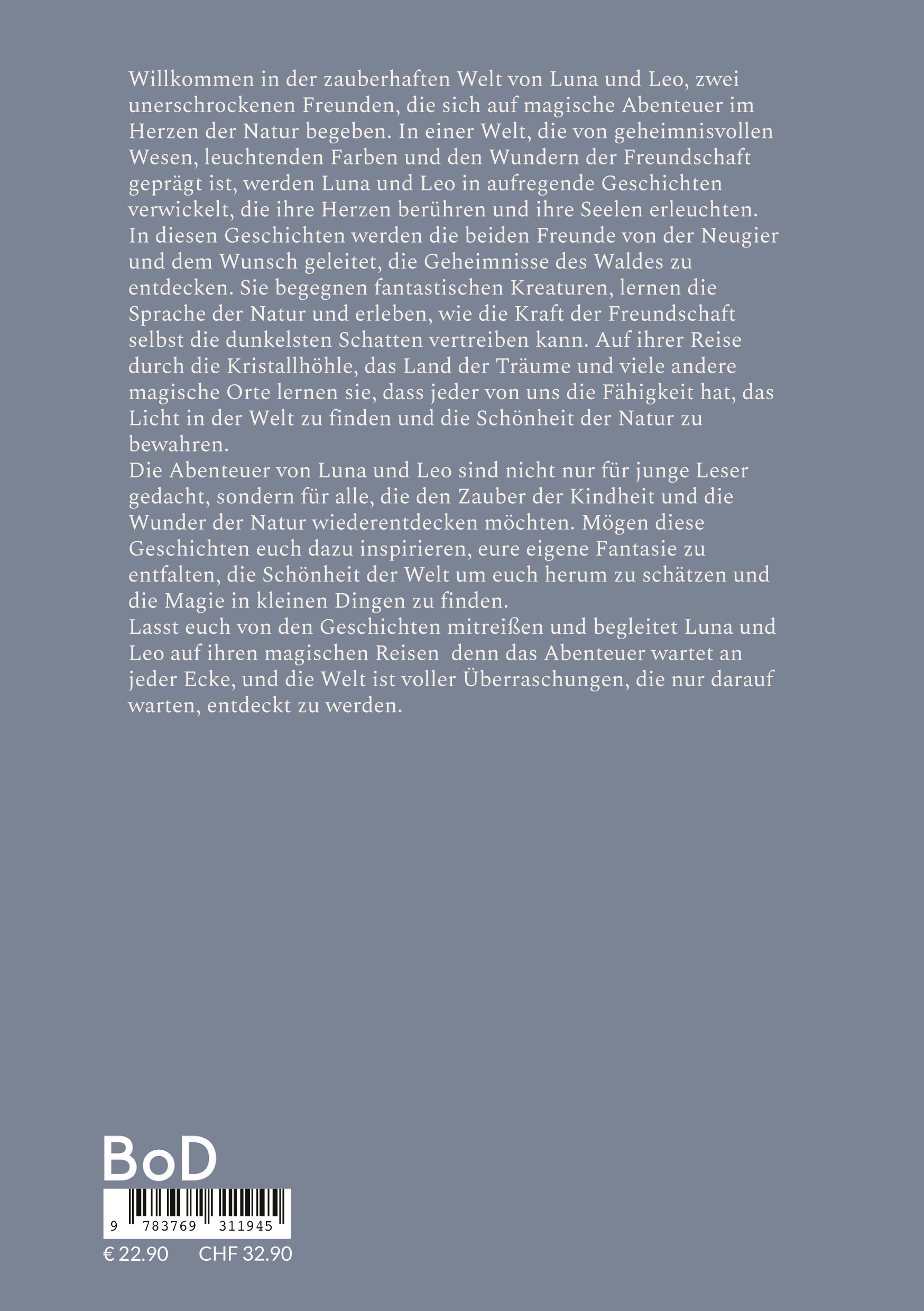 Die Abenteuer von Luna und Leo sind nicht nur für junge Leser gedacht, sondern für alle, die den Zauber der Kindheit und die Wunder der Natur wiederentdecken möchten. Mögen diese Geschichten euch dazu inspirieren, eure eigene Fantasie zu entfalten, die Schönheit der Welt um euch herum zu schätzen und die Magie in kleinen Dingen zu finden.