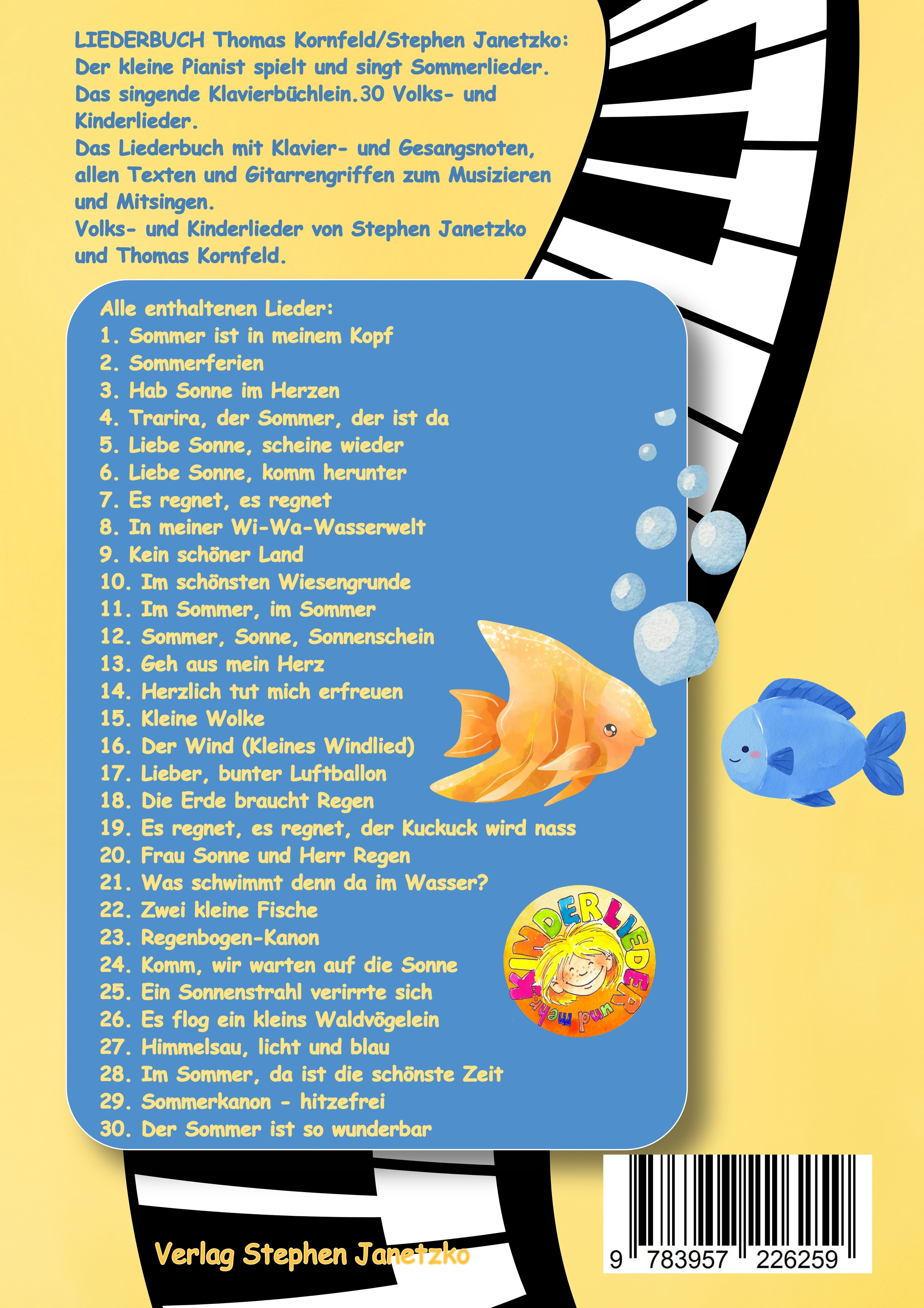 Der kleine Pianist spielt und singt Sommerlieder. Das singende Klavierbüchlein. 30 Volks- und Kinderlieder. Das Liederbuch mit Klavier- und Gesangsnoten, allen Texten und Gitarrengriffen zum Musizieren und Mitsingen. Volks- und Kinderlieder von Stephen Janetzko und Thomas Kornfeld. "Gibt es eventuell auch von all den vielen schönen Liedern des Verlages kurze und leichte Klavierstücke für Anfänger?" Wir freuen uns, diese Frage nun mit "Ja!" zu beantworten und können hier zu vielen Liedern leichte bis mittelschwere Klaviersätze anbieten. Wir wollen sogar noch einen Schritt weitergehen: Warum nur Klavier spielen und nicht auch noch dazu singen? Beides gemeinsam stellt hohe Ansprüche an die Musikalität der Kinder und ist eine anspruchsvolle künstlerische Aufgabe. In unseren Sommerliedern sind Sonne, Wind und Wasser, besonders für die großen Ferien, bei den Kindern von Bedeutung. Wir haben neben den üblichen Vokalnoten mit Text und Gitarrenharmonien den Klaviersatz mit einer Gesangstimme gegenübergestellt. Der Klaviersatz gibt die Melodie des Liedes detailgetreu wieder. So kann jeder selbst entscheiden welche Fassung des Liedes musiziert werden soll, egal ob als eigenständiger Klaviervortrag oder als Klavierbegleitung zum Klassengesang, für die Chorarbeit oder den Sologesang. Darüber hinaus stellen wir alle Klaviersätze zu Demonstrationszwecken als Audios zum Download bereit. Viel Freude und Erfolg beim Klavierspielen und Singen wünschen die Autoren. PS. Weitere Ausgaben in selber Aufmachung sind in dieser Reihe zu weiteren Themen erhältlich und in Vorbereitung.Alle enthaltenen Lieder: 1. Sommer ist in meinem Kopf 2. Sommerferien 3. Hab Sonne im Herzen 4. Trarira, der Sommer, der ist da 5. Liebe Sonne, scheine wieder 6. Liebe Sonne, komm herunter 7. Es regnet, es regnet 8. In meiner Wi-Wa-Wasserwelt 9. Kein schöner Land 10. Im schönsten Wiesengrunde 11. Im Sommer, im Sommer 12. Sommer, Sonne, Sonnenschein 13. Geh aus mein Herz 14. Herzlich tut mich erfreuen 15. Kleine Wolke 16. Der Wind (Kleines Windlied) 17. Lieber, bunter Luftballon 18. Die Erde braucht Regen 19. Es regnet, es regnet, der Kuckuck wird nass 20. Frau Sonne und Herr Regen 21. Was schwimmt denn da im Wasser? 22. Zwei kleine Fische 23. Regenbogen-Kanon 24. Komm, wir warten auf die Sonne 25. Ein Sonnenstrahl verirrte sich 26. Es flog ein kleins Waldvögelein 27. Himmelsau, licht und blau 28. Im Sommer, da ist die schönste Zeit 29. Sommerkanon - hitzefrei 30. Der Sommer ist so wunderbar