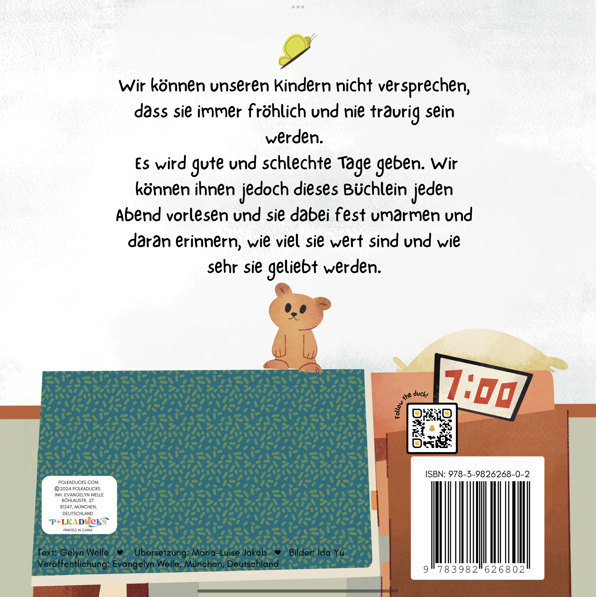 Wir können unseren Kindern nicht versprechen, dass sie immer fröhlich und nie traurig sein werden. Es wird gute und schlechte Tage geben. Wir können ihnen jedoch dieses Büchlein jeden Abend vorlesen und sie dabei fest umarmen und daran erinnern, wie viel sie wert sind und wie sehr sie geliebt werden.