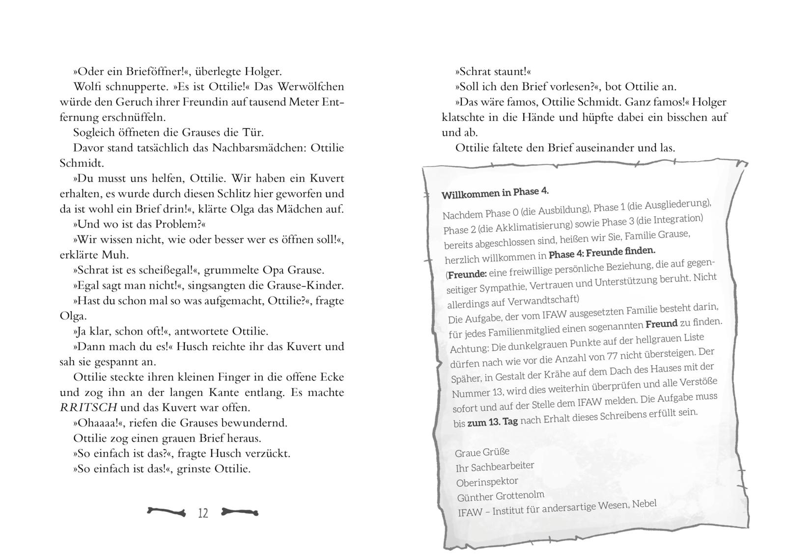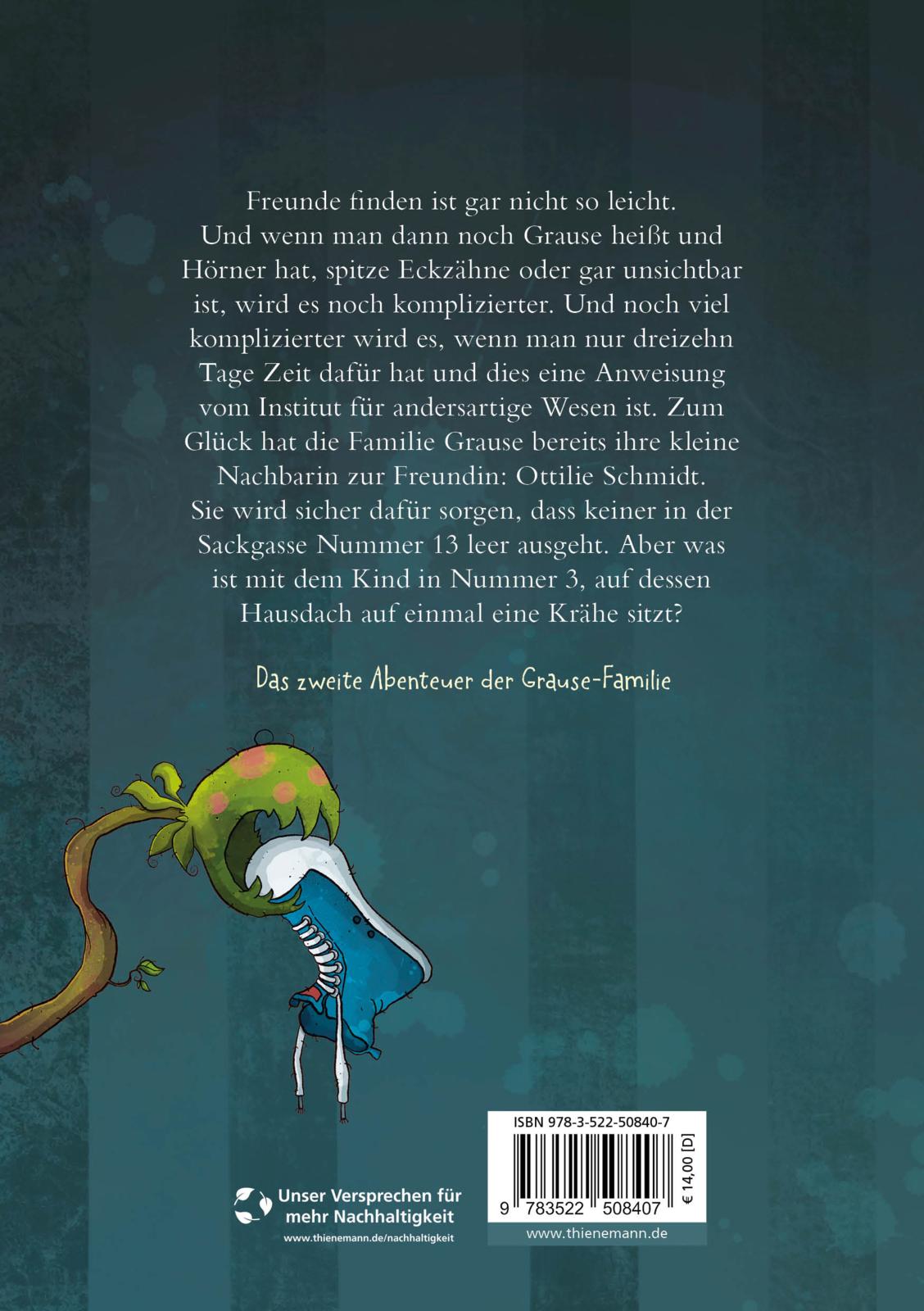 Freunde finden ist gar nicht so leicht. Und wenn man dann noch Grause heißt und Hörner hat, spitze Eckzähne oder gar unsichtbar ist, wird es noch komplizierter. Und noch viel komplizierter wird es, wenn man nur dreizehn Tage Zeit dafür hat und dies eine Anweisung vom Institut für andersartige Wesen ist. Zum Glück hat die Familie Grause bereits ihre kleine Nachbarin zur Freundin: Ottilie Schmidt. Sie wird sicher dafür sorgen, dass keiner in der Sackgasse Nummer 13 leer ausgeht. Aber was ist mit dem Kind in Nummer 3, auf dessen Hausdach auf einmal eine Krähe sitzt?