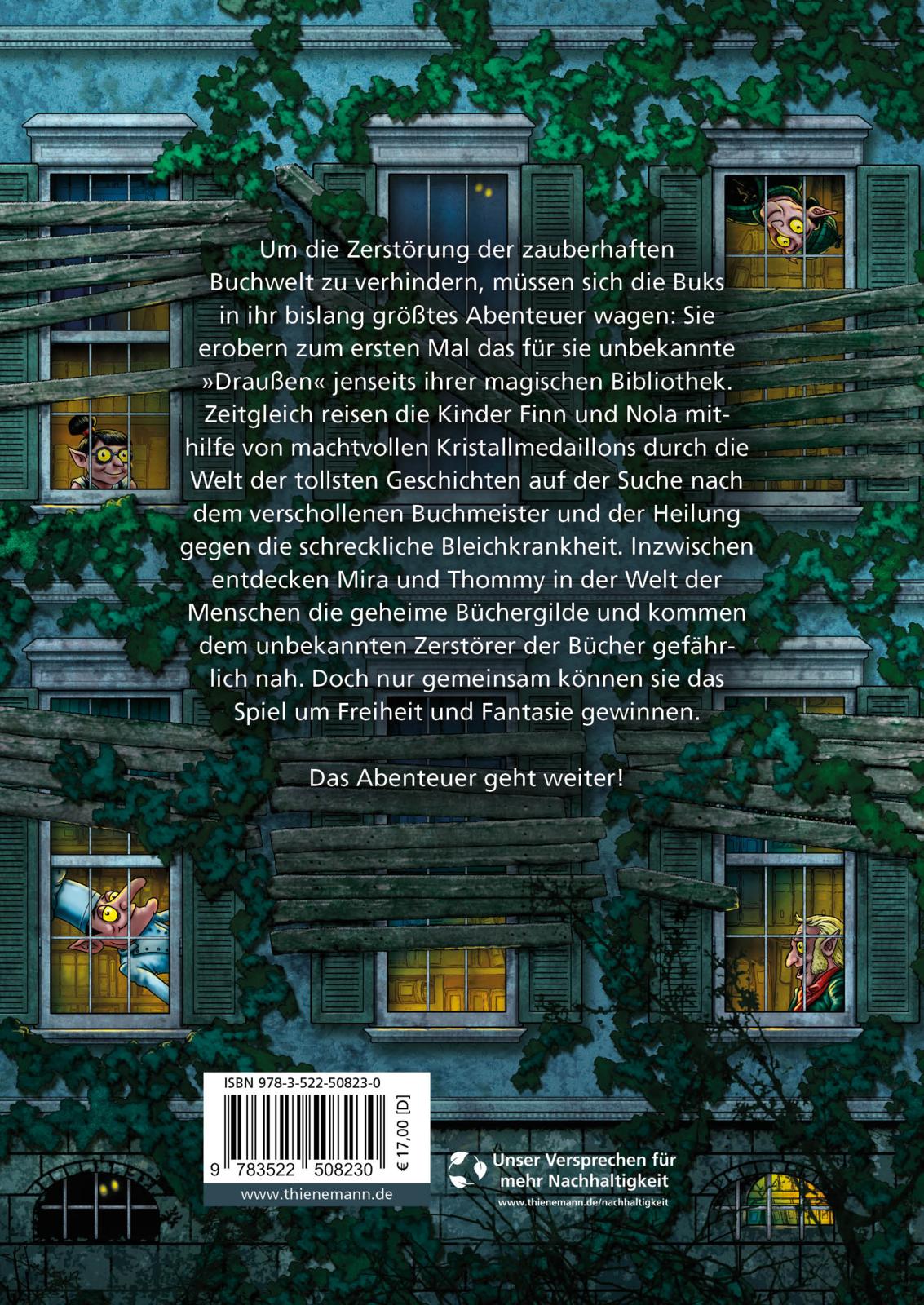 Um die Zerstörung der zauberhaften Buchwelt zu verhindern, müssen sich die Buks in ihr bislang größtes Abenteuer wagen: Sie erobern zum ersten Mal das für sie unbekannte "Draußen" jenseits ihrer magischen Bibliothek. Zeitgleich reisen die Kinder Finn und Nola mithilfe von machtvollen Kristallmedaillons durch die Welt der tollsten Geschichten auf der Suche nach dem verschollenen Buchmeister und der Heilung gegen die schreckliche Bleichkrankheit. Inzwischen entdecken Mira und Thommy in der Welt der Menschen die geheime Büchergilde und kommen dem unbekannten Zerstörer der Bücher gefährlich nah. Doch nur gemeinsam können sie das Spiel um Freiheit und Fantasie gewinnen.