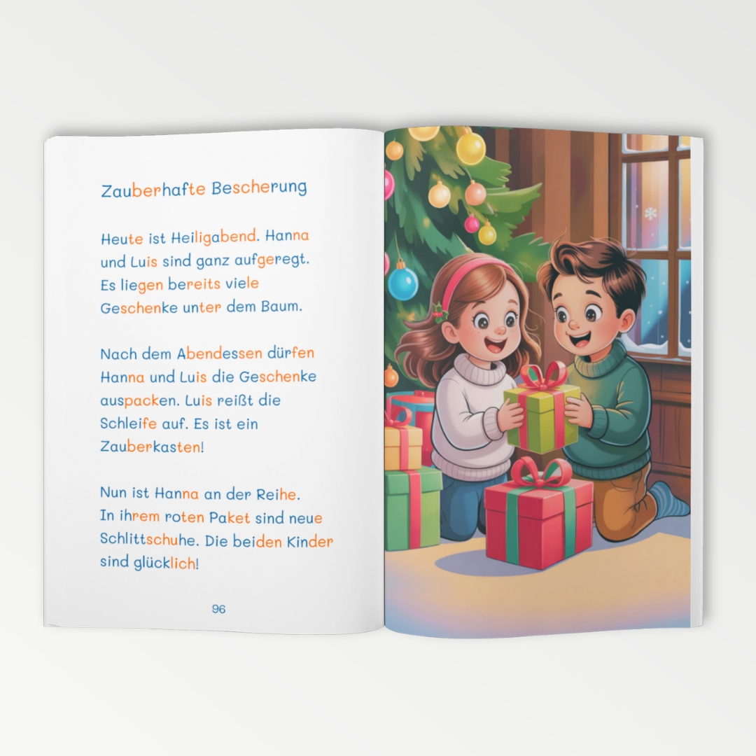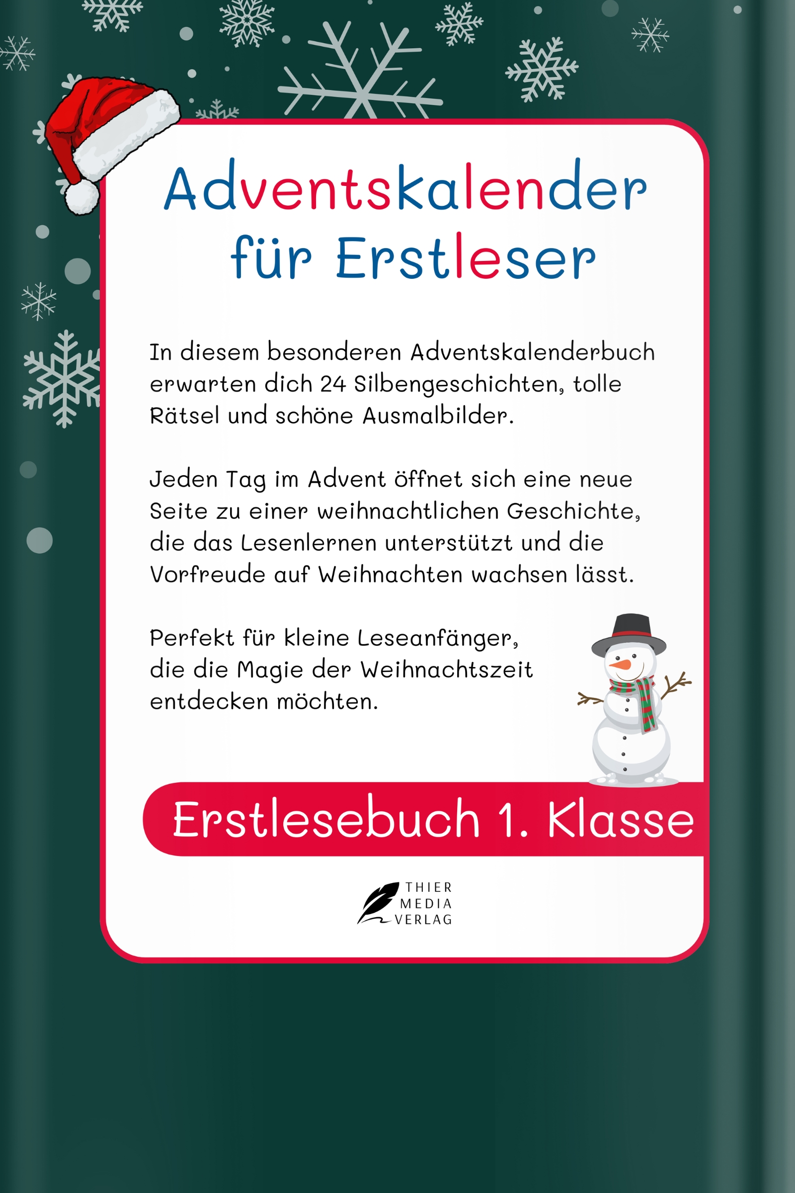 Adventskalenderbuch für Erstleser - 24 Silbengeschichten für die WeihnachtszeitDieses liebevoll gestaltete Adventskalenderbuch sorgt für täglichen Lesespaß im Dezember! Mit 24 kurzen, leicht verständlichen Silbengeschichten begleitet es Kinder durch die Adventszeit und fördert spielerisch das Lesenlernen.Die farbige Silbenmarkierung hilft beim Silbenlesen und stärkt den Lesefluss, während die große Schrift und das klare Layout für Übersicht und Lesefreude sorgen. So haben Leseanfänger in der 1. Klasse jeden Tag ein kleines Erfolgserlebnis.Die Geschichten sind abwechslungsreich und weihnachtlich gestaltet - von lustigen Schulmomenten bis zu magischen Winterabenteuern ist alles dabei. Rätsel und Ausmalbilder zwischen den Geschichten bieten zusätzliche Abwechslung und fördern Kreativität und Konzentration.Das Buch ist perfekt geeignet für Kinder, die gerade lesen lernen, und macht das tägliche Lesen im Advent zu einem besonderen Ritual.Ob als Geschenk, zur Einstimmung auf Weihnachten oder als liebevolle Ergänzung zum Adventskalender - dieses pädagogisch wertvolle Lesebuch vereint Leseförderung, Spaß und festliche Stimmung.