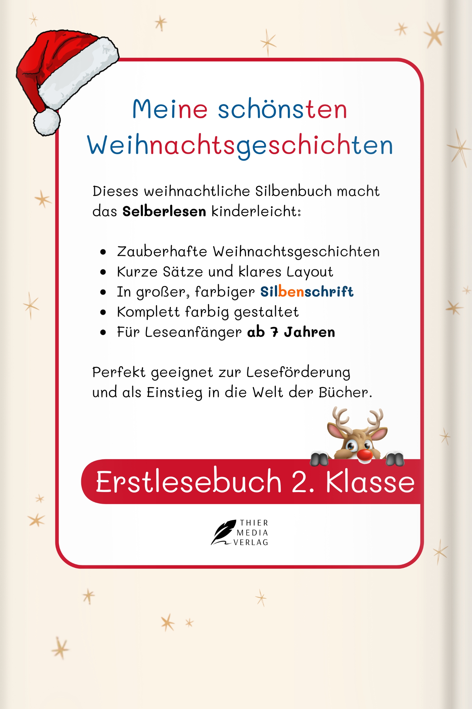 Weihnachtsgeschichten für Kinder ab 7 Jahren - Das perfekte Lesebuch für die 2. Klasse! Dieses zauberhafte Weihnachtsbuch bietet 34 liebevoll illustrierte Geschichten, die speziell für Kinder der 2. Klasse konzipiert wurden. Ideal für kleine Leser ab 7 Jahren, die das Silbenlesen weiter üben und ihre Lesefähigkeiten festigen möchten. Die kurzen, kindgerechten Geschichten machen nicht nur Spaß, sondern fördern auch das Leseverständnis und sorgen dafür, dass Lesen zu einem echten Vergnügen wird. Farbenfrohe Illustrationen erwecken die Geschichten zum Leben und machen dieses Buch zu einem ganz besonderen Erlebnis. Es lädt Kinder ein, in die magische Welt der Weihnacht einzutauchen und gleichzeitig ihre Lesefreude zu stärken. Ob in der Schule, zu Hause oder als gemütliche Vorlesezeit in der Adventszeit - dieses Buch begeistert junge Leser und bringt die festliche Stimmung direkt in die Kinderzimmer. Mit seinen 34 spannenden und herzerwärmenden Geschichten zählt es zu den besten Weihnachtsbüchern für Erstleserund eignet sich hervorragend als Geschenk für kleine Bücherwürmer. Es kombiniert perfekt Spaß und Lernfortschritt, sodass Kinder auf spielerische Weise ihr Lesen verbessern können. Tauchen Sie gemeinsam mit Ihrem Kind in die wunderbare Welt der Weihnachtsgeschichten ein und lassen Sie die Vorfreude auf das Fest wachsen. Dieses Buch ist ein Muss für alle kleinen Weihnachtsfans der 2. Klasse, die ihre Leselust weiter entfalten möchten!