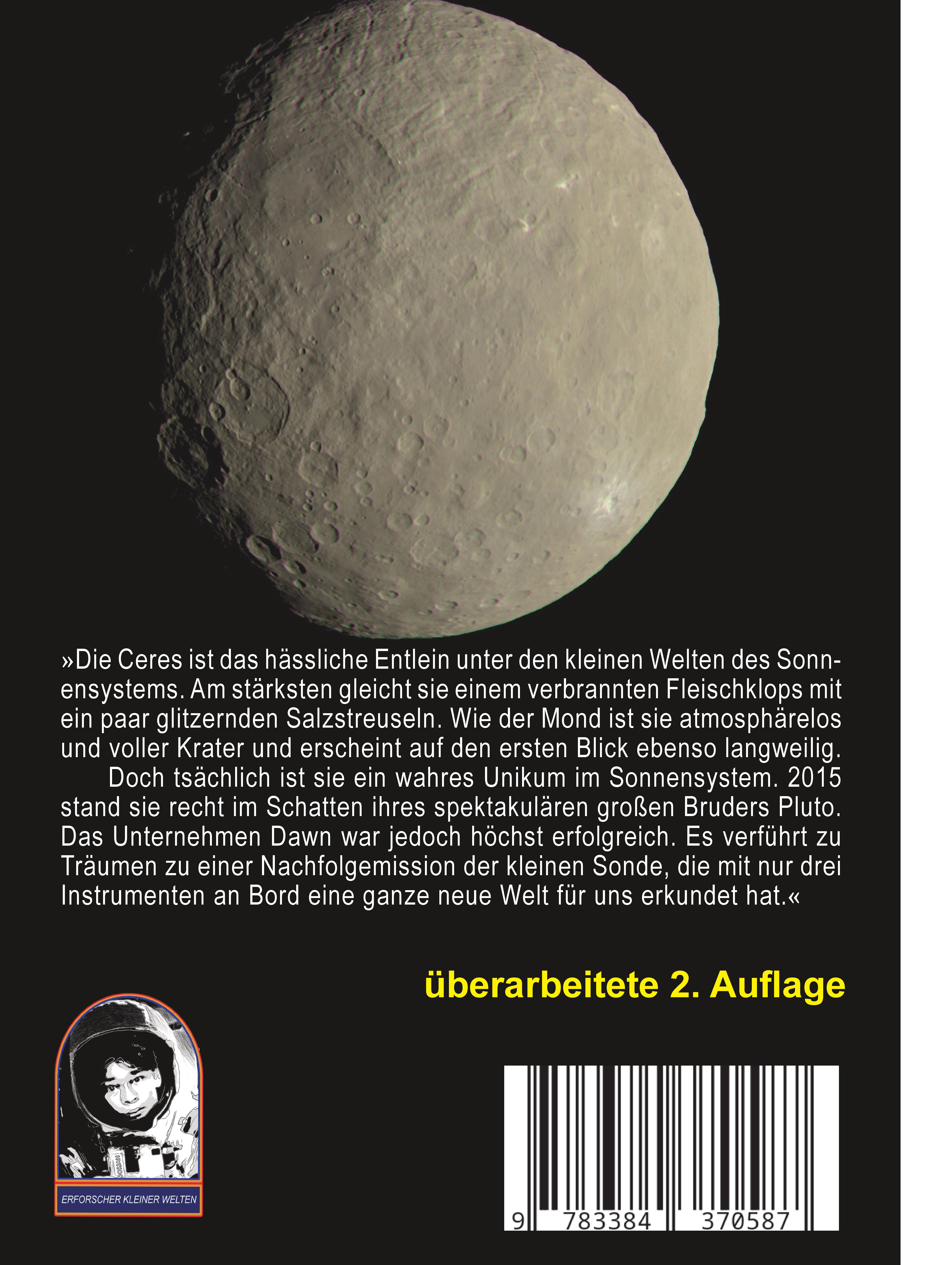»Die Ceres ist das hässliche Entlein unter den kleinen Welten des Sonnensystems. Am stärksten gleicht sie einem verbrannten Fleischklops mit ein paar glitzernden Salzstreuseln. Wie der Mond ist sie atmosphärelos und voller Krater und erscheint auf den ersten Blick ebenso langweilig.Doch tsächlich ist sie ein wahres Unikum im Sonnensystem. 2015 stand sie recht im Schatten ihres spektakulären großen Bruders Pluto. Das Unternehmen Dawn war jedoch höchst erfolgreich. Es verführt zu Träumen zu einer Nachfolgemission der kleinen Sonde, die mit nur drei Instrumenten an Bord eine ganze neue Welt für uns erkundet hat.«Diese vollständig überarbeitete Neuauflage gibt einen Überblick über die bis 2024 erfolgten Auswertungen des Unternehmens Dawn und stellt den erdnächsten Zwergplaneten ausführlich vor.
