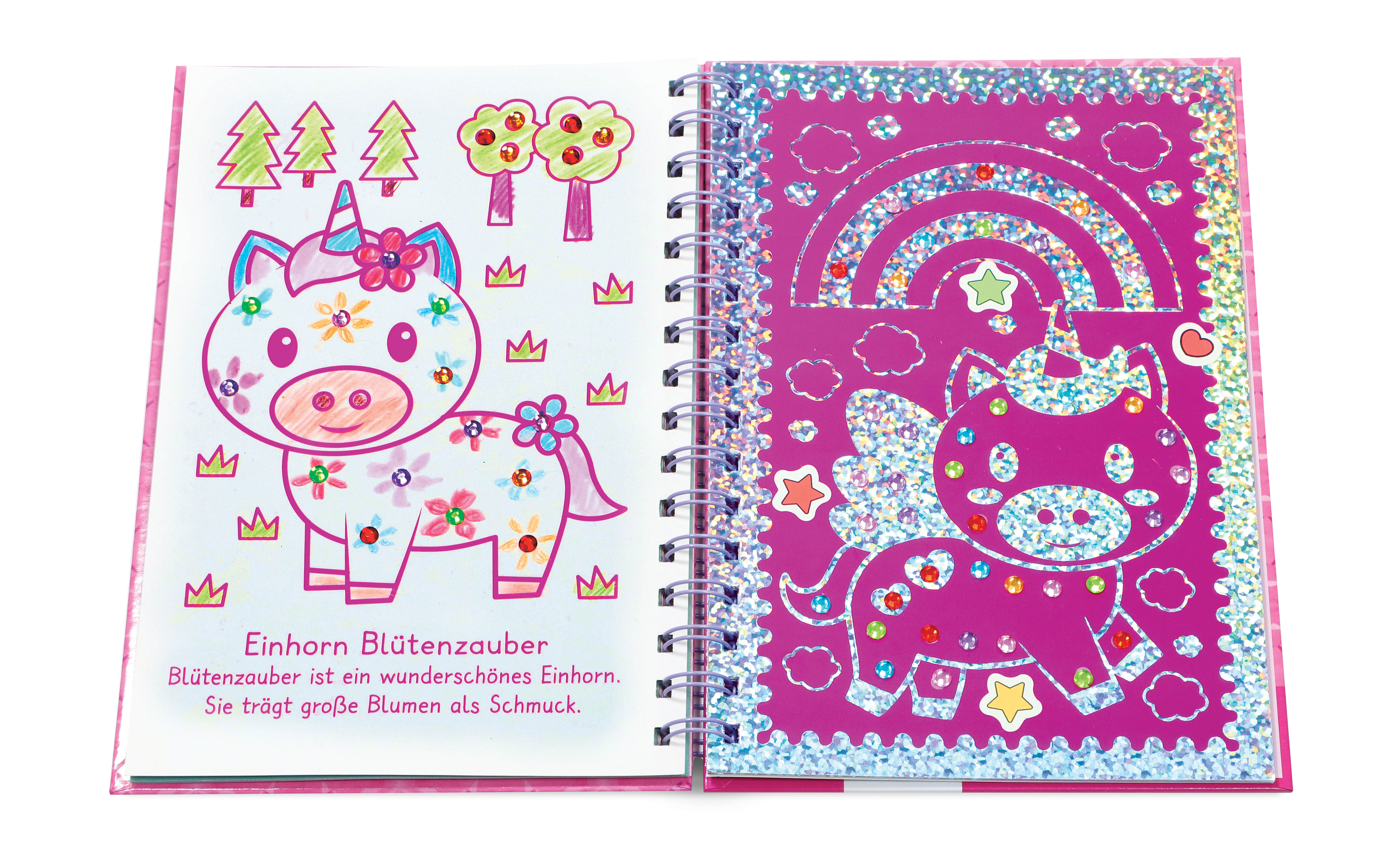 | Zusatzinfo | Mit Stickerbogen mit über 300 Glitzersteinen, 100 farbigen Stickern auf 2 zusätzlichen Seiten und Silberfolienprägung auf 8 Karten. |
