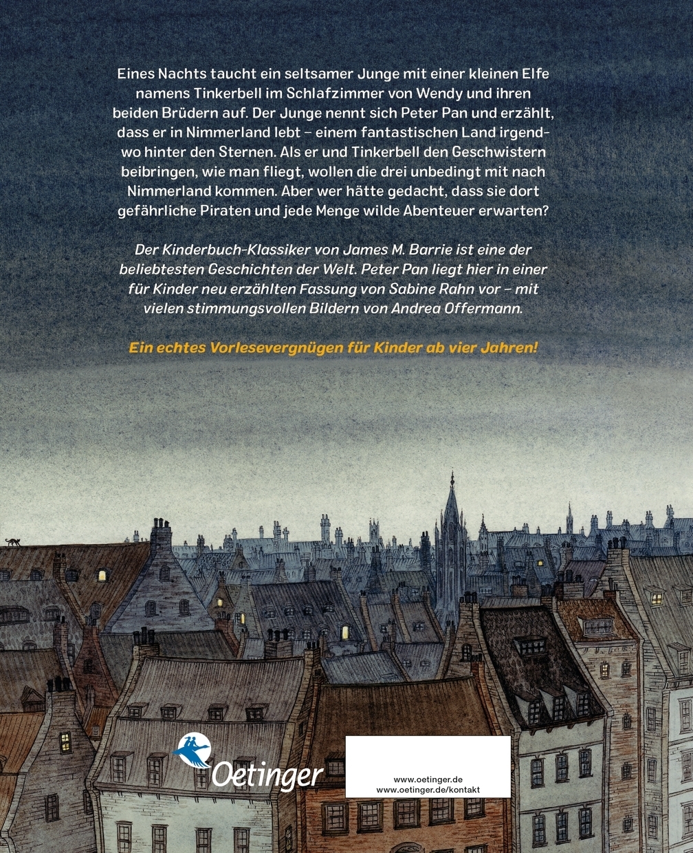 "Kinderbuchautorin Sabine Rahn arbeitete den Klassiker von J. M . Barrie in zeitgerechten Texten neu auf. Verantwortlich für die Bebilderung der Geschichte ist Andrea Offermann. Feine Striche, eine gedeckte und trotzdem bunte Farbwahl sowie der Verzicht auf unnötige Ausschmückungen illustrieren gefühlvoll die wichtigsten Teile der Erzählung." Luna, Mai/Juni 2013