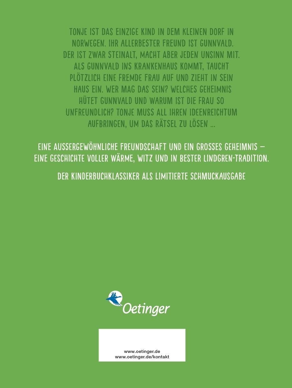 Tonje bringt Sonnenschein! Ein Buch, das glücklich macht. Tonje ist das einzige Kind in dem kleinen Dorf, in dem sie lebt. Ihr allerbester Freund ist Gunnvald. Der ist zwar steinalt, macht aber jeden Unsinn mit, den Tonje sich ausdenkt. Und das ist eine ganze Menge! Als Gunnvald ins Krankenhaus kommt, taucht plötzlich eine fremde Frau auf und zieht in sein Haus ein. Wer mag das sein? Welches Geheimnis hütet Gunnvald und warum ist die Frau so unfreundlich? Tonje muss all ihren Ideenreichtum aufwenden, um das Rätsel zu lösen! Eine außergewöhnliche Freundschaft und ein großes Geheimnis - ein Kinderbuch voller Wärme, Witz und in bester Lindgren-Tradition.