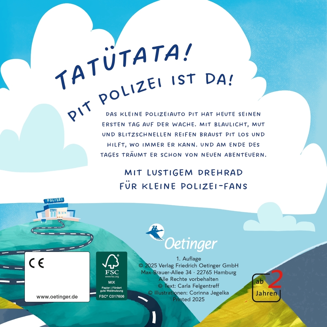 Polizeiauto Pit hat heute seinen ersten Tag auf der Wache. Mit Blaulicht und Sirene startet er durch! Die Abenteuer warten schon: Erst muss er einem verirrten Autokind helfen, dann schon regelt er den Verkehr nach einem Unfall. Das Drehrad sorgt für zusätzlichen Spaß beim Entdecken des Polizei-Alltags.