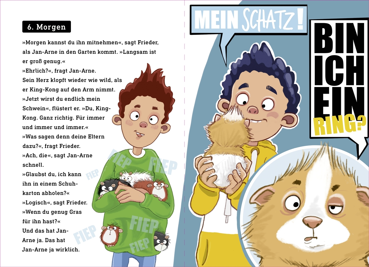 King-Kong, ein Schwein auf geheimer Mission. Susanna hat Junge gekriegt. Fünf Stück auf einmal. Das ist bei Meerschweinchen nichts Besonderes. Eins von ihnen gehört jetzt Jan-Arne. Nett, dass Frieder es ihm geschenkt hat. Einfach so. Es fühlt sich warm und weich an, und wenn man es in die Hand nimmt, fiept es ganz leise. Frieder sagt, dass es ein Weibchen ist, aber Jan-Arne gibt ihm den Namen King-Kong. Schließlich soll es mal groß und stark und wild werden.
