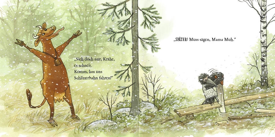 Mama Muh möchte mit ihrer Freundin Krähe spielen. Schlittenfahren, Angeln, Rad fahren – eigentlich könnten die beiden so eine schöne Zeit haben. Doch Krähe ist immer mit ihren Werkeleien beschäftigt und sagt ständig „Später!“ und „Warte mal!“. Aber irgendwann hat Krähe endlich Zeit für Mama Muh und zeigt ihr, woran sie gearbeitet hat: An einem Ort, um gemeinsam Zeit zu verbringen!