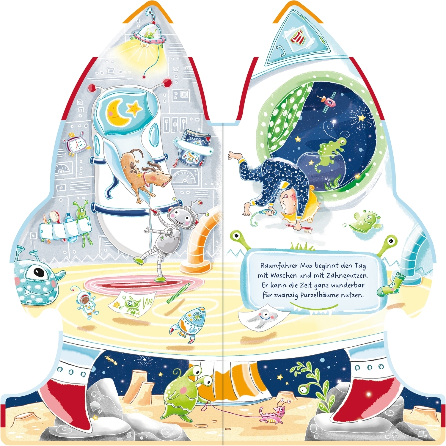 Der kleine Astronaut Max erlebt einen aufregenden Tag in seinem Raumschiff. In der Schwerelosigkeit machen Purzelbäume noch mehr Spaß. Zusammen mit seiner besten Freundin, der Hündin Luna, erkundet er das All, repariert seine Rakete und freundet sich sogar mit lustigen Außerirdischen an! Und bevor es Zeit fürs Bett ist, telefoniert Max mit seiner Familie weit weg auf der Erde.