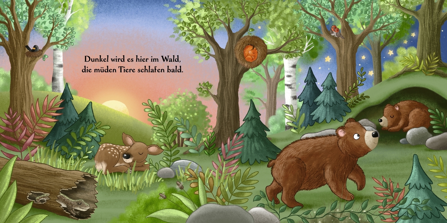 Mit dem Einbruch der Dunkelheit kehrt Ruhe im Wald ein. Während einige müde Tiere schlafen gehen, erwachen andere. Der Dachs, das Glühwürmchen, die Eule, der Igel und die Fledermausfamilie werden aktiv, bis der nächste Morgen anbricht.