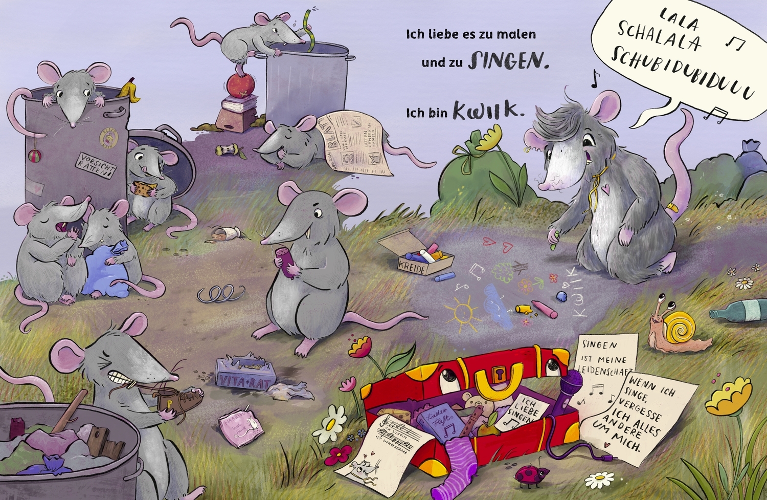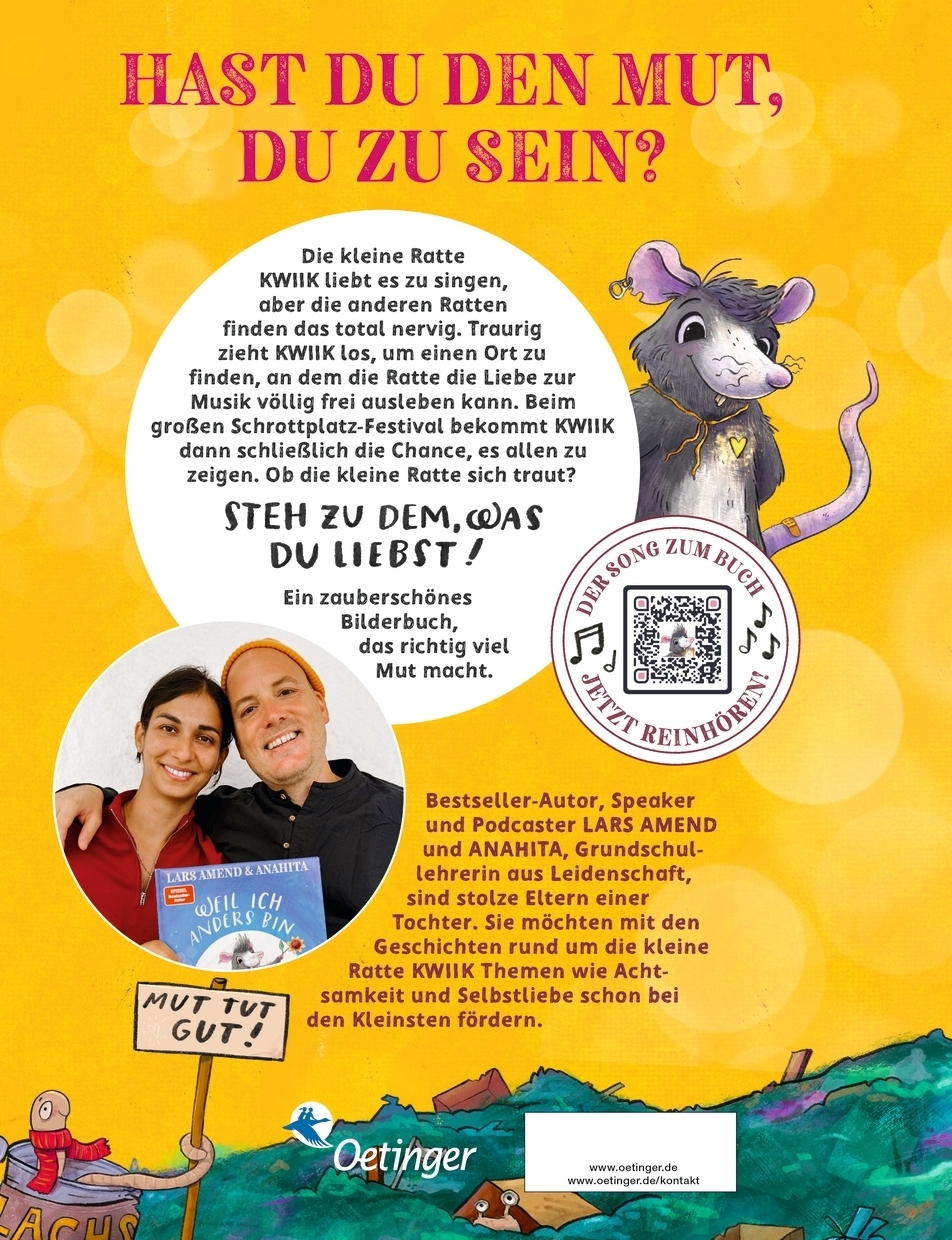 Steh zu dir und zu dem, was du liebst! Die kleine Ratte Kwiik liebt es zu singen, aber die anderen Ratten finden das total nervig und lachen Kwiik aus. Traurig zieht Kwiik los, um einen Ort zu finden, an dem die Ratte die Liebe zur Musik ungehemmt ausleben kann. Beim großen Schrottplatz-Festival bekommt Kwiik schließlich die Chance, vor anderen zu singen. Ob Kwiik sich traut, ganz zu sich selbst und zu der großen Leidenschaft zur Musik zu stehen? Ein wunderschönes Bilderbuch, das Klein und Groß zu Selbstliebe auffordert und richtig viel Mut macht.