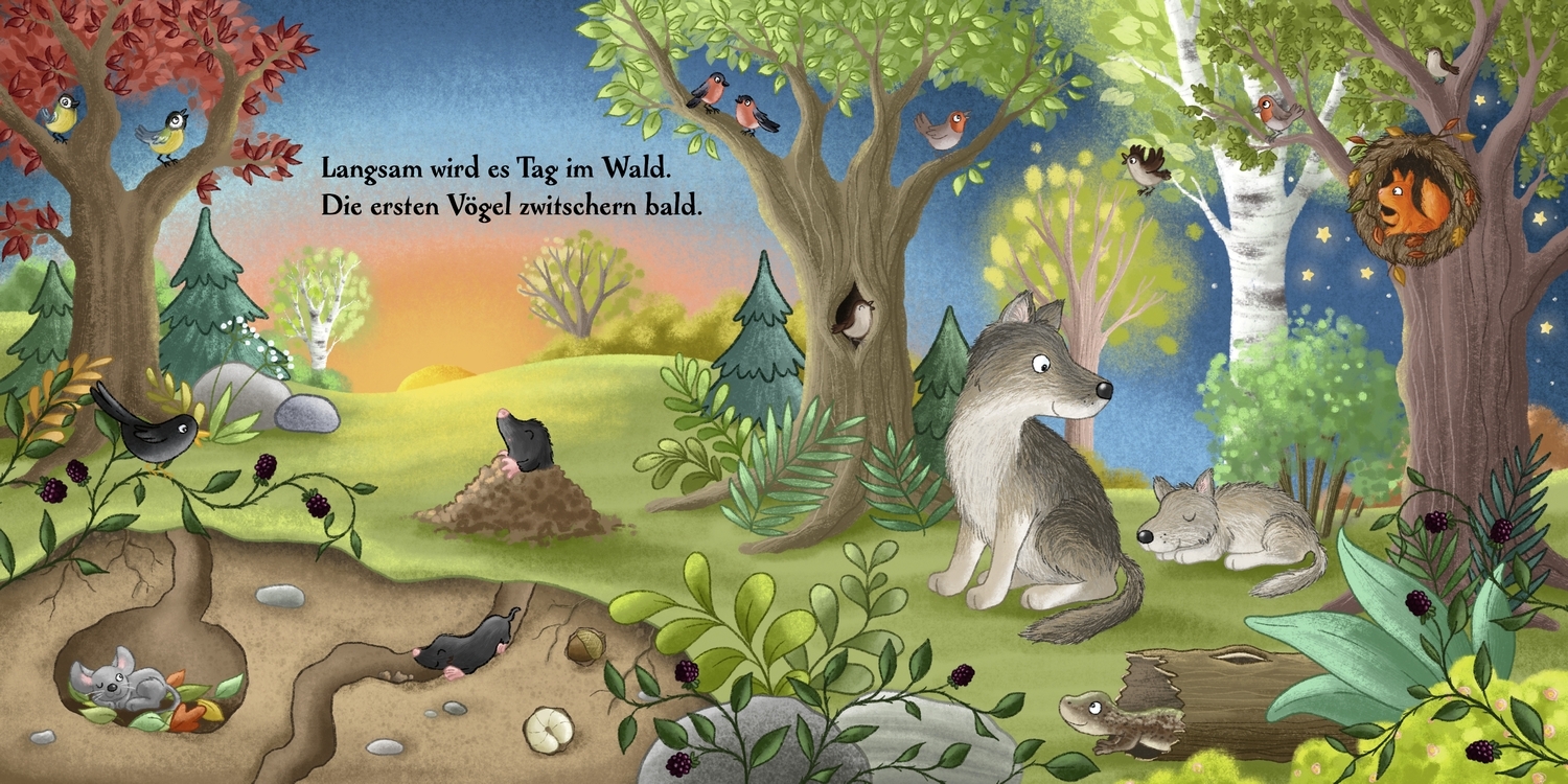Mit der aufgehenden Sonne erwacht der Wald zum Leben. Vögel zwitschern, Hasen hüpfen durch den Klee, das müde Reh steht auf und der kleine Bär kommt aus seiner Höhle. Nur die Fledermausfamilie ruht sich noch aus. Allererstes gereimtes Sachwissen über den Tag im Wald.