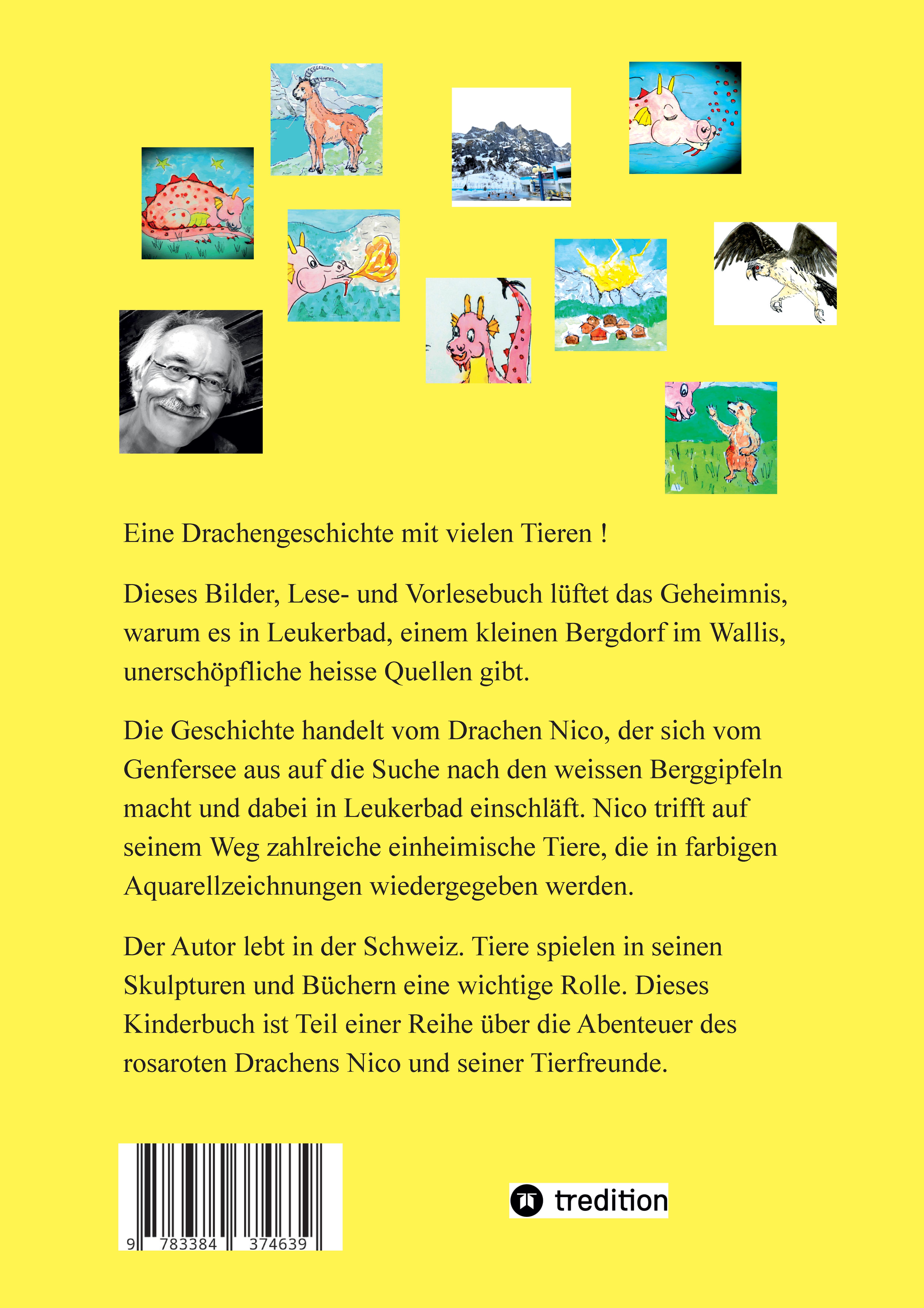 Ein Lese-, Erzähl- und Vorlesebuch mit vielen Zeichnungen von einheimischen Tieren. Und ein Buch, in dem das Geheimnis der heissen Quellen von Leukerbad gelüftet wird. Der riesengrosse Drache Nico lebt im Genfersee und will herausfinden, warum die hohen Berge so weiss sind. Er macht sich auf den Weg ins Wallis und gelangt bis nach Leukerbad. Dort ist er so erschöpft, dass er für immer einschläft. Auf seiner abenteuerlichen Wanderung lernt Nico viele Tiere kennen.