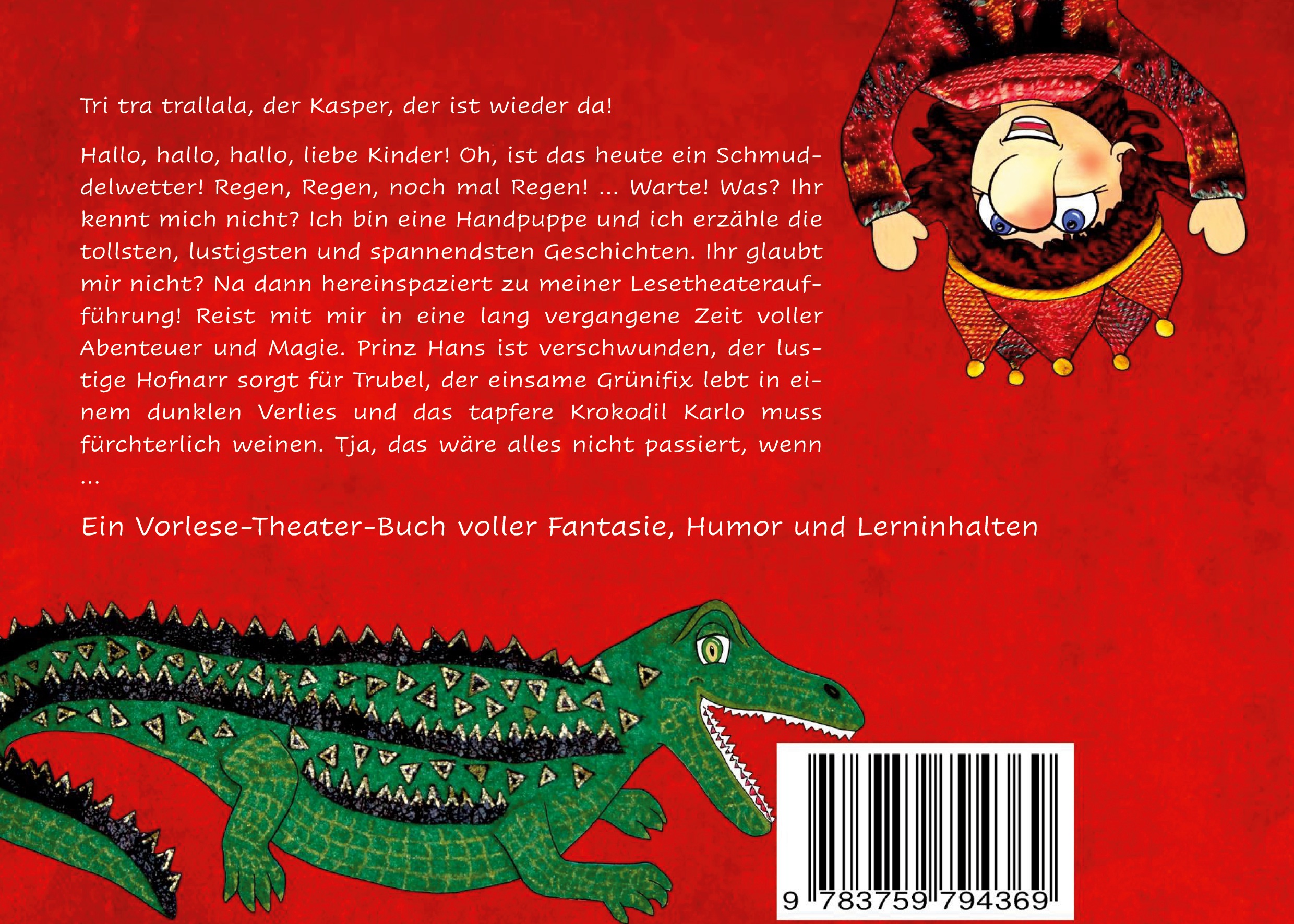 Tri tra trallala, der Kasper, der ist wieder da! Hallo, hallo, hallo, liebe Kinder, oh, ist das heute ein Schmuddelwetter. Regen, Regen, noch mal Regen! Warte! Was? Ihr kennt mich nicht? Ich bin eine Handpuppe und ich erzähle die tollsten, lustigsten und spannendsten Geschichten. Ihr glaubt mir nicht? Na dann hereinspaziert zu meiner Lesertheateraufführung! Reist mit mir in eine lang vergangene Zeit voller Abenteuer und Magie. Prinz Hans ist verschwunden, der lustige Hofnarr sorgt für Trubel, der einsame Grünifix lebt in einem dunklen Verlies und das tapfere Krokodil Karlo muss fürchterlich weinen. Werden das Königspaar, Prinzessin Laura und die Hexe Ulla den Prinzen wiederfinden? Tja, das wäre alles nicht passiert, wenn ...