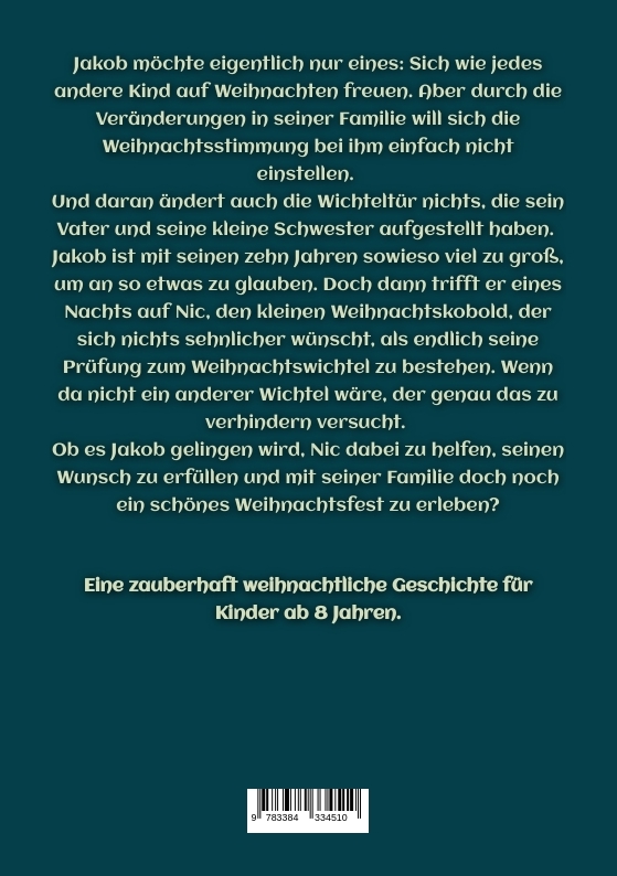 Jakob wünscht sich nur eines: Ein schönes Weihnachtsfest mit seiner Familie zu verbringen. Aber aufgrund von familiären Veränderungen will die Weihnachtsstimmung sich einfach nicht einstellen. Jakob glaubt, dass daran auch die Wichteltür, die sein Vater und seine kleine Schwester aufstellen, auch nichts ändern wird. Bis er auf den kleinen Weihnachtskobold Nic trifft, der sich nichts sehnlicher wünscht, als endlich seine Prüfung zum Weihnachtswichtel zu bestehen. Wenn da nicht ein anderer Wichtel wäre, der genau das zu verhindern versucht. "Jakob und der Weihnachtskobold" ist eine magische Weihnachtsgeschichte über Freundschaft, Familie und was an Weihnachten wirklich wichtig ist.