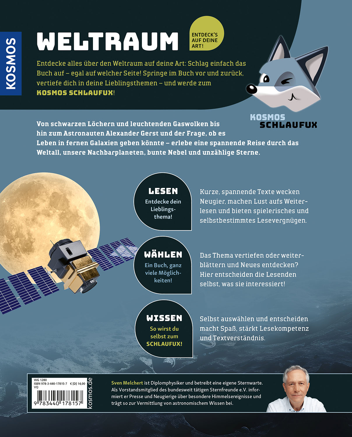 Mit dem SchlauFUX entdecken Kinder interaktiv das Thema Weltraum und begeben sich auf eine faszinierende Reise durch das Universum. Jede Buchseite ist darauf ausgelegt, neue Wissensimpulse zu geben, die es den jungen Lesern ermöglichen, die Inhalte eigenständig und ohne feste Reihenfolge zu erkunden. Dank dieser Struktur können Kinder ihren Interessen folgen und sich intensiv mit Themen wie Schwarzen Löchern, leuchtenden Gaswolken und den Planeten unseres Sonnensystems befassen. Basierend auf dem bewährten Konzept der Choose-your-own-adventure-Bücher verbindet SchlauFUX spielerisches Lernen mit fundiertem Sachwissen. Dadurch wird das Lesen zu einem individuellen Erlebnis, das die Neugierde fördert und das Bedürfnis nach Entdeckung erfüllt.