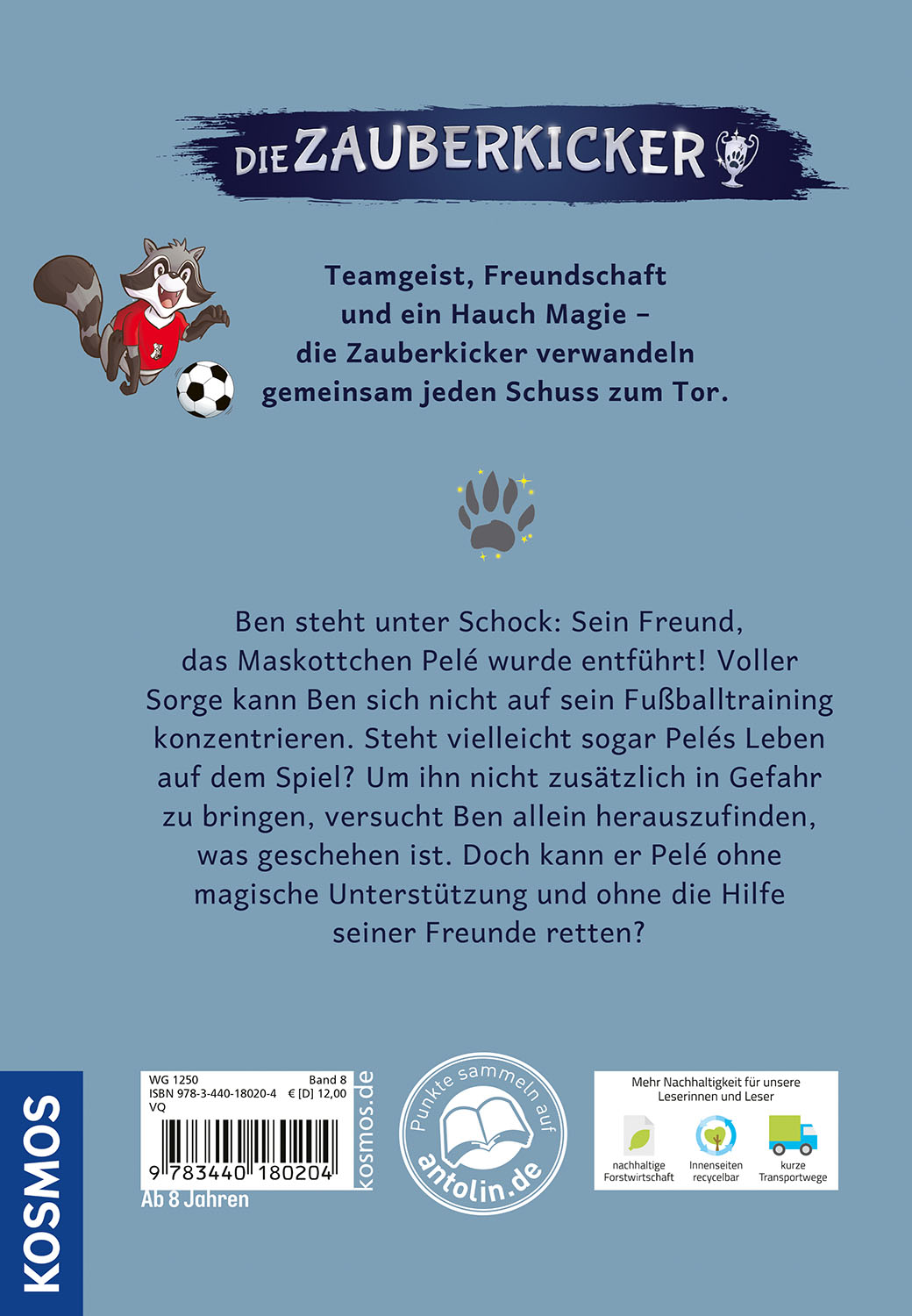 Wo ist Waschbär Pelé? Sein Freund Ben hat einen Erpresserbrief erhalten. Kann er den Fall allein lösen und das magische Maskottchen finden? Oder braucht er die Hilfe der anderen Zauberkicker Mika und Robin? Eine turbulente Fußball- und Freundschaftsgeschichte mit witzigen Charakteren und einer Portion Magie.