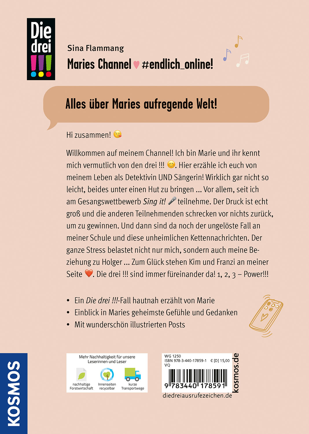 Endlich berühmt! Marie Grevenbroich von den drei !!! geht online: Als Singer-Songwriterin und Schauspielerin startet sie ihren eigenen Channel. Er läuft schnell richtig gut und immer mehr Fans folgen ihr. Der Karriere steht nichts mehr im Weg. Oder? Doch der Erfolg hat auch seine Schattenseiten. Wie geht Marie mit seltsamen Werbeanfragen, Eifersucht und Cyber-Mobbing um? Ein actionreicher und witziger Krimi-Roman im Post-Stil rund um Social Media, Freundschaft, Liebe und Lifestyle. Mit coolen Extras: wunderschön illustrierte Channel-Post, lustige Chats und Tipps zum richtigen Umgang mit Social Media..