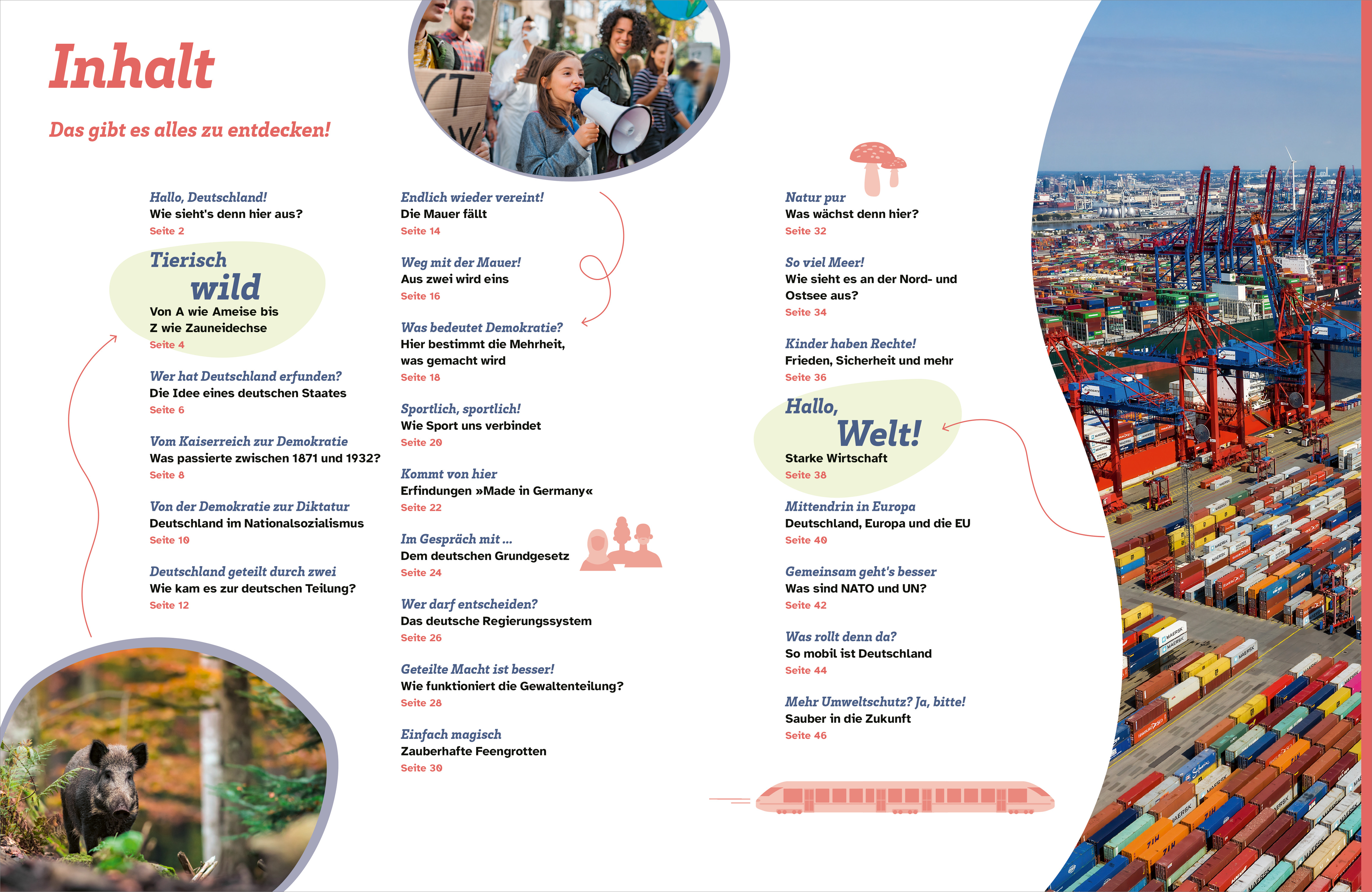 Folgende Themenbereiche gibt es zu entdecken: Leben in Stadt und Land: Wie unterscheidet sich das Leben auf dem Land und in der Großstadt? Kultur und Alltag: Entdecke typische Feste, Essen, Musik und Traditionen. Politik und Gesellschaft: Einfach erklärt: Was ist ein Bundesland? Wer bestimmt in Deutschland? Bunte Vielfalt: Deutschland ist ein Land der Kulturen – lerne mehr über unsere Vielfalt und das Zusammenleben.