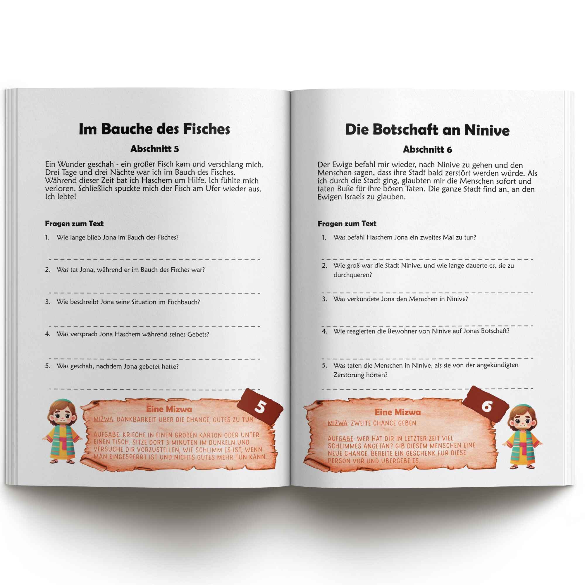 Das Mitmach-Arbeitsheft ermöglicht es den Kindern, die Geschichte des Jona und der Tschuwa der Stadt Ninive nach dem Lesen zu bearbeiten, indem sie fünf Quizfragen zu jedem der gelesenen Megilla-Abschnitte zu beantworten. Es enthält außerdem eine spannende Challenge in Form einer aktiven Mitzwa am Ende jedes Kapitels, was den Lernprozess noch unterhaltsamer gestaltet.