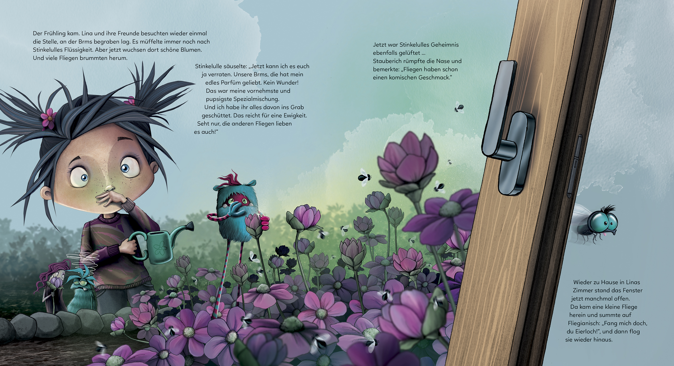 Eines Tages im Herbst verirrt sich eine Fliege in Linas Kinderzimmer. Muddelkuddel, Stauberich und Stinkelulle, die drei Monsterfreunde und seit langem bei Lina zu Hause, sind begeistert: Endlich haben sie ein Haustier! Sie kümmern sich um ihre neue Spielkameradin, haben viel Spaß mit Brms und lernen am Ende, dass so ein Fliegenleben nicht allzu lange währt.