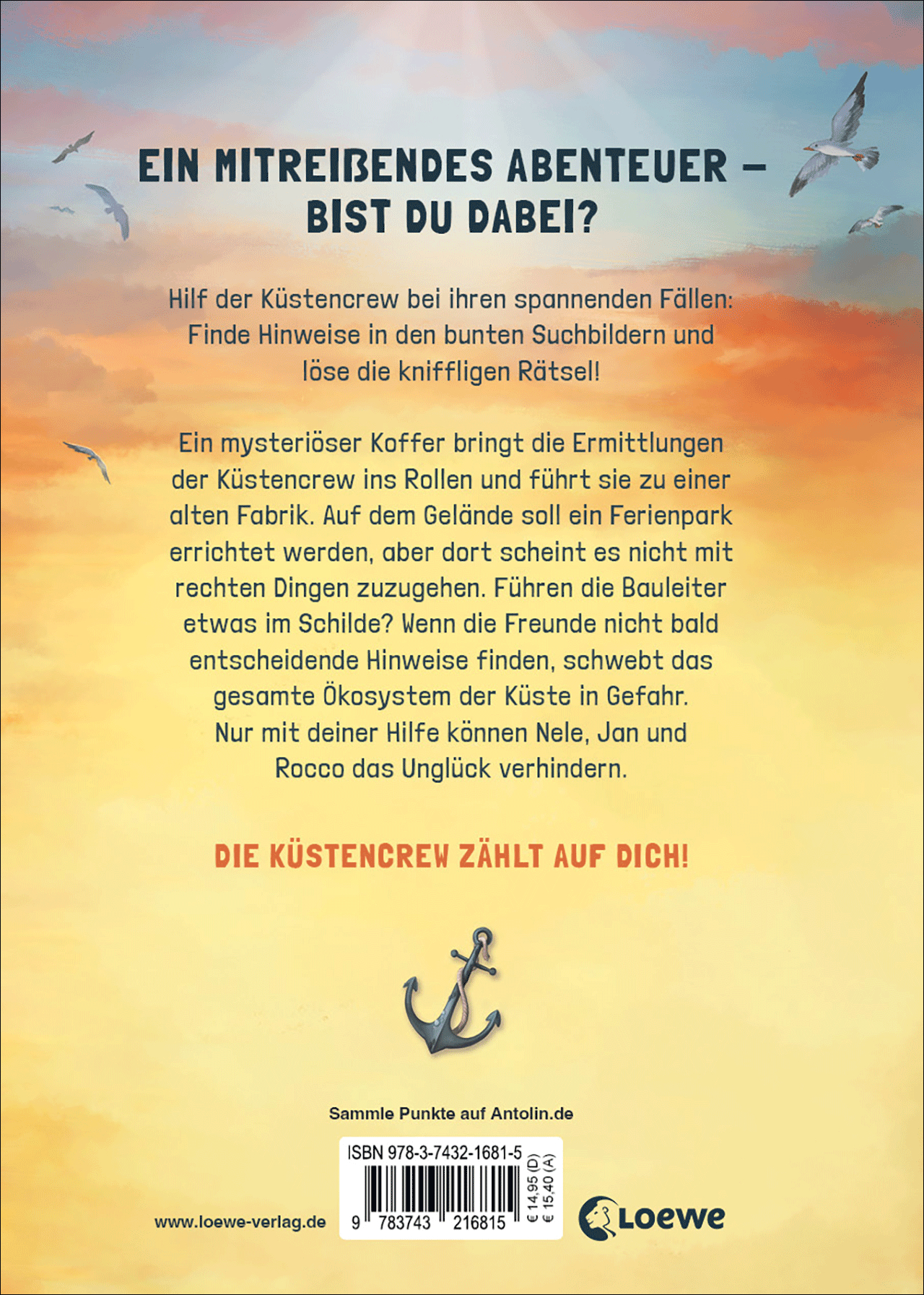 Ein mysteriöser Koffer bringt die Ermittlungen der Küstencrew ins Rollen und führt sie zu einer alten Fabrik. Auf dem Gelände soll ein Ferienpark errichtet werden, aber dort scheint es nicht mit rechten Dingen zuzugehen. Führen die Bauleiter etwas im Schilde? Wenn die Freunde nicht bald entscheidende Hinweise finden, schwebt das gesamte Ökosystem der Küste in Gefahr. Nur mit deiner Hilfe können Nele, Jan und Rocco das Unglück verhindern.