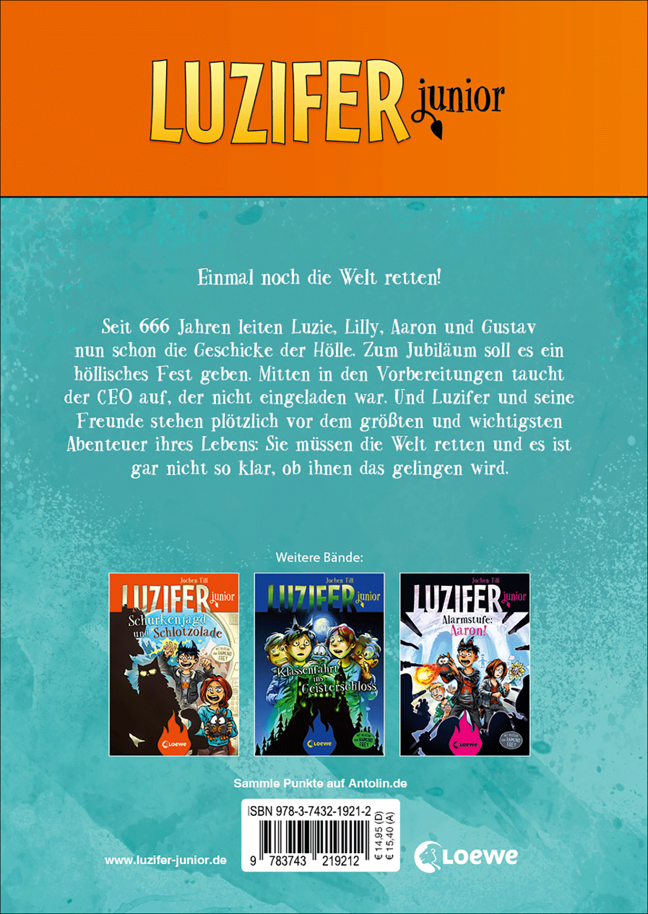 Das große Luzifer junior Finale! Es ist schon mehr als 666 Jahre her, dass Luzifer junior von seinem Papa auf die Erde geschickt wurde, um bei uns zu lernen, wie man richtig böse ist. Aber irgendwann war die schöne Schulzeit in Sankt Fidibus zu Ende und seither leiten Luzie, Lilly, Gustav und Aaron die Geschicke der Hölle. Zeit für ein höllisches Jubiläumsfest! Dass sie sich noch am selben Tag auf den Weg machen müssen, um die Welt zu retten, ahnt natürlich noch niemand - ob es ihnen wohl gelingen wird? Völlig unverhofft erwartet die Freunde das größte und wichtigste Abenteuer ihres Lebens!