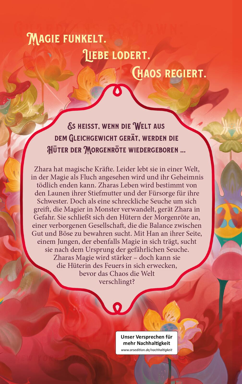 Zhara hat magische Kräfte. Leider lebt sie in einer Welt, in der Magie als Fluch angesehen wird und ihr Geheimnis tödlich enden kann. Zharas Leben wird bestimmt von den Launen ihrer Stiefmutter und der Fürsorge für ihre Schwester. Doch als eine schreckliche Seuche um sich greift, die Magier in Monster verwandelt, gerät Zhara in Gefahr. Sie schließt sich den Hütern der Morgenröte an, einer verborgenen Gesellschaft, die die Balance zwischen Gut und Böse zu bewahren sucht. Mit Han an ihrer Seite, einem Jungen, der ebenfalls Magie in sich trägt, sucht sie nach dem Ursprung der gefährlichen Seuche. Zharas Magie wird stärker - doch kann sie die Hüterin des Feuers in sich erwecken, bevor das Chaos die Welt verschlingt?