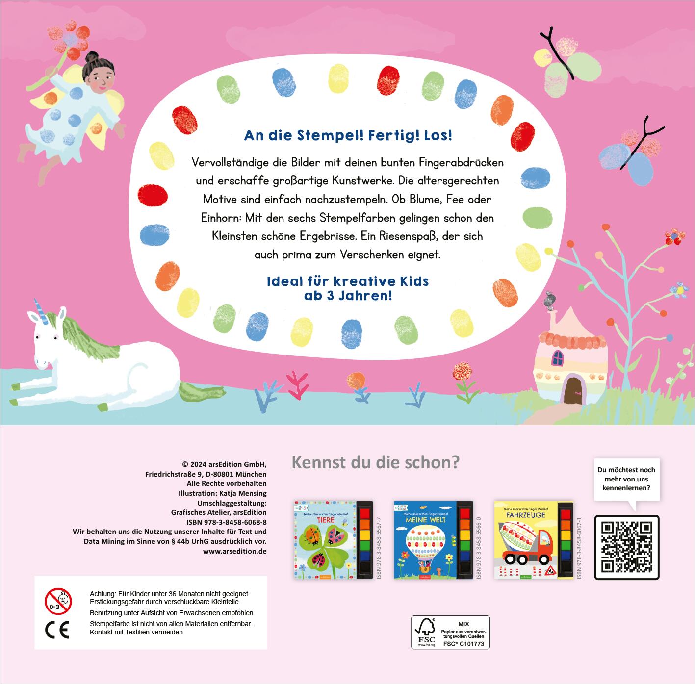 Mit den 6 bunten Finger-Stempelfarben kann man einzelne Szenen kreativ vervollständigen und so großartige Kunstwerke erschaffen. Die altersgerechten Motive sind einfach nachzustempeln. Ob Blume, Fee oder Einhorn: So einfach kann Malen sein!