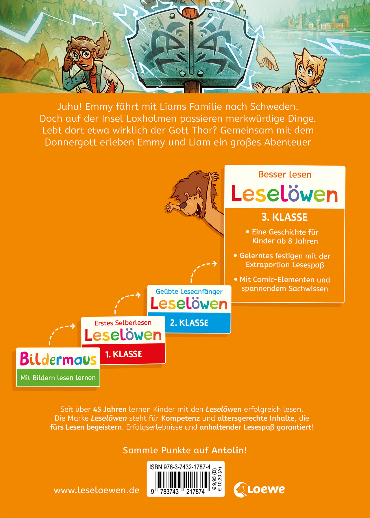 Die Leselöwen für die 3. Klasse richten sich an Kinder, die sich mit dem Lesen noch schwertun. Spannende Geschichten treffen hier auf coole Illustrationen und ein innovatives Layout. Das motiviert und sorgt für extraviel Lesespaß. Für Emmi und Liam wird der Urlaub in Schweden zum echten Abenteuer. Ihr Nachbar ist niemand Geringerer als Thor, der Donnergott höchstpersönlich! Doch wo Thor ist, ist auch die Gefahr nicht weit. In einer Vollmondnacht taucht plötzlich die Midgardschlange auf und zieht eine Spur der Verwüstung hinter sich her. Werden Emmi und Liam es zusammen mit Thor schaffen, sie zu vertreiben? Und wer hat das Monster überhaupt auf die Insel gelockt?