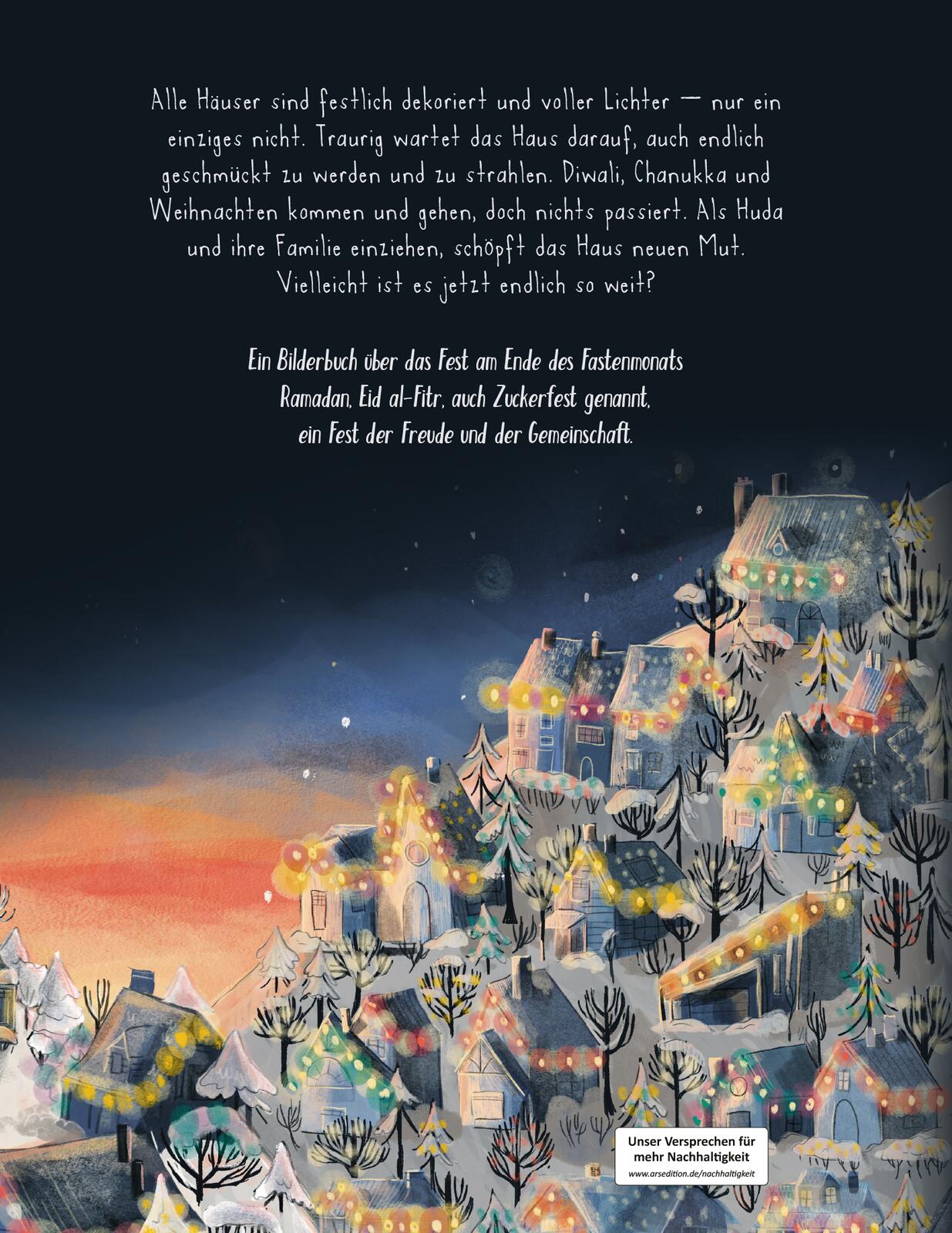 Als Huda und ihre Familie einziehen, schöpft das Haus neuen Mut. Vielleicht ist es jetzt endlich so weit? Wird das Haus zum Id genauso hell erleuchtet und voller Freude sein wie die Nachbarhäuser? Schnell merkt Haus aber, dass jede Familie Freude und Zusammengehörigkeit auf ihre eigene Weise feiert, egal zu welcher Jahreszeit. Und ein paar Monate später ist es dann doch endlich soweit: Diese Familie feiert ihren eigenen Feiertag, Eid-al-Fitr, das Zuckerfest. Endlich wird auch Haus leuchten und glänzen, als einziges in der Nachbarschaft!