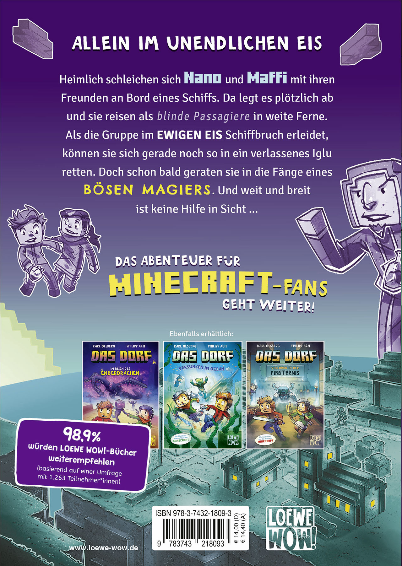 Verschollen im ewigen Eis Als ein mysteriöser Magier das Dorf besucht, schleichen sich Nano und Maffi mit ihren Freunden Poka und Bingo heimlich an Bord seines Schiffs. Da legt dieses plötzlich ab und die Kinder reisen als blinde Passagiere in weite Ferne! Nachdem sie im ewigen Eis Schiffbruch erleiden, retten sie sich in ein verlassenes Iglu. Doch schon bald finden sie heraus, dass sich der Magier dort ein geheimes Labor eingerichtet hat und Böses plant. Weit und breit ist keine Hilfe in Sicht - und für die Flucht scheint es bereits zu spät ... Loewe Wow! meets Minecraft: die perfekte Mischung für alle Fans des Computerspiels und von Abenteuergeschichten!
