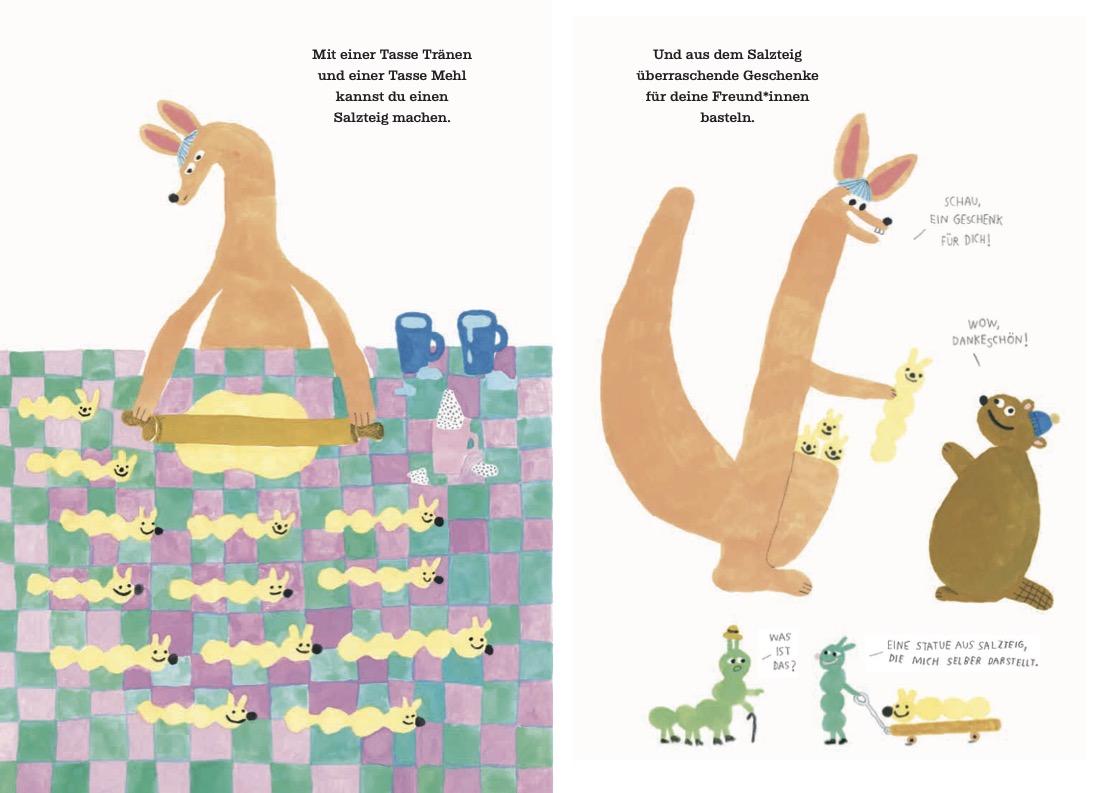 Bei dem Versuch, einen traurig aussehenden Wurm aufzuheitern, macht die Erzählerin des Buches alles noch schlimmer und bringt ihn zum Weinen, besser gesagt: zum Schluchzen, so sehr, dass er die Seiten mit Tränen überflutet. Tränen sind aber gar nicht so schlimm, im Gegenteil: Mit Tränen kann man ganz schön viele Dinge tun. Man kann Blumen gießen, im Winter darauf Schlittschuh fahren, den Boden damit putzen und Spaghetti darin kochen. Alle weinen, sogar Superheld*innen, Polizist*innen und Ameisen. Tränen sagen mehr als tausend Worte.