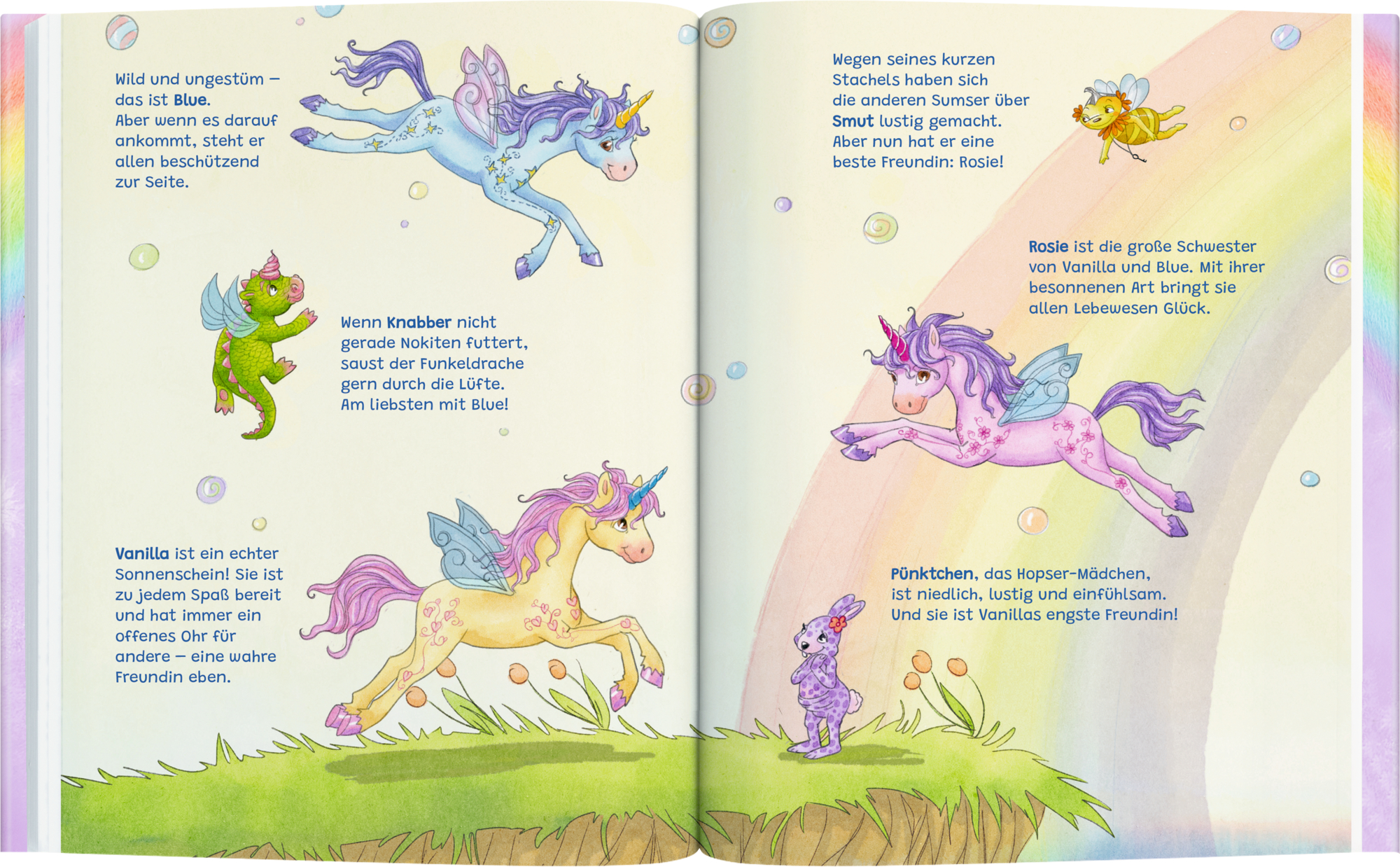Hinter dem Horizont, am Ende des Regenbogens liegt es: das Einhorn-Paradies. Dort ist jeder Tag ein zauberhaftes Abenteuer für die drei kleinen Einhörner Vanilla, Rosie und Blue.
