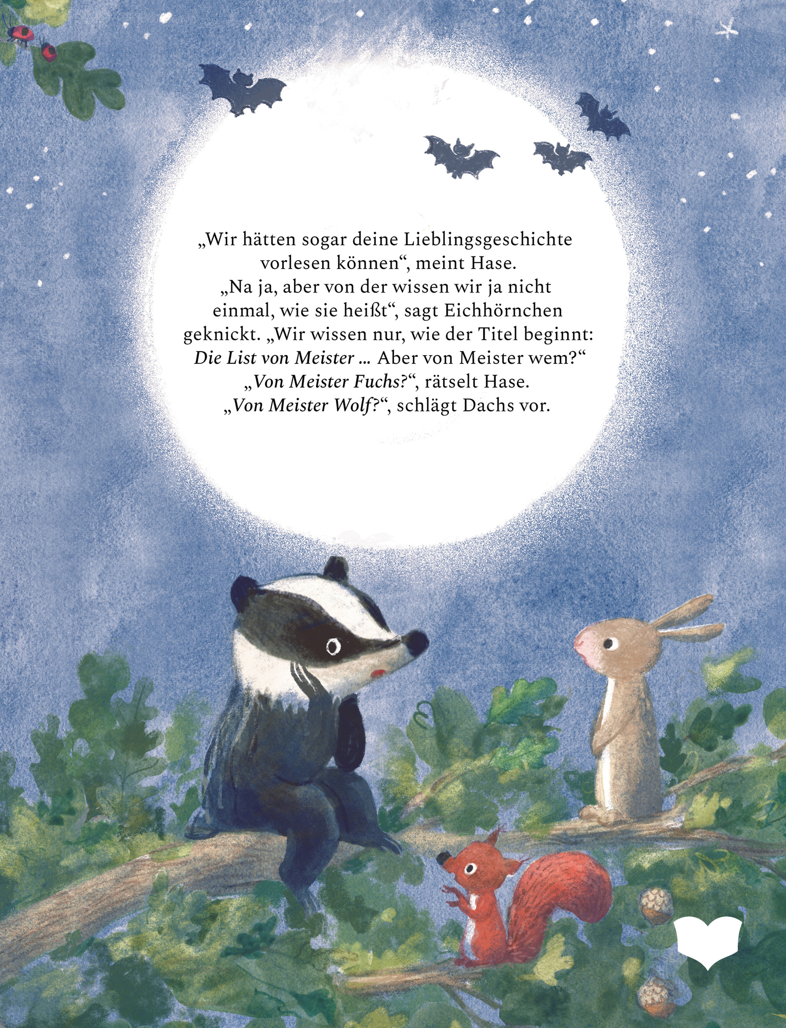 Tatjana Mai-Wyss entführt zur Geschichte von Christelle Saquet mit stimmungsvollen Bildern in den nächtlichen Wald zur Baumbibliothek von Uhu Uhuwe und seinen Freunden.