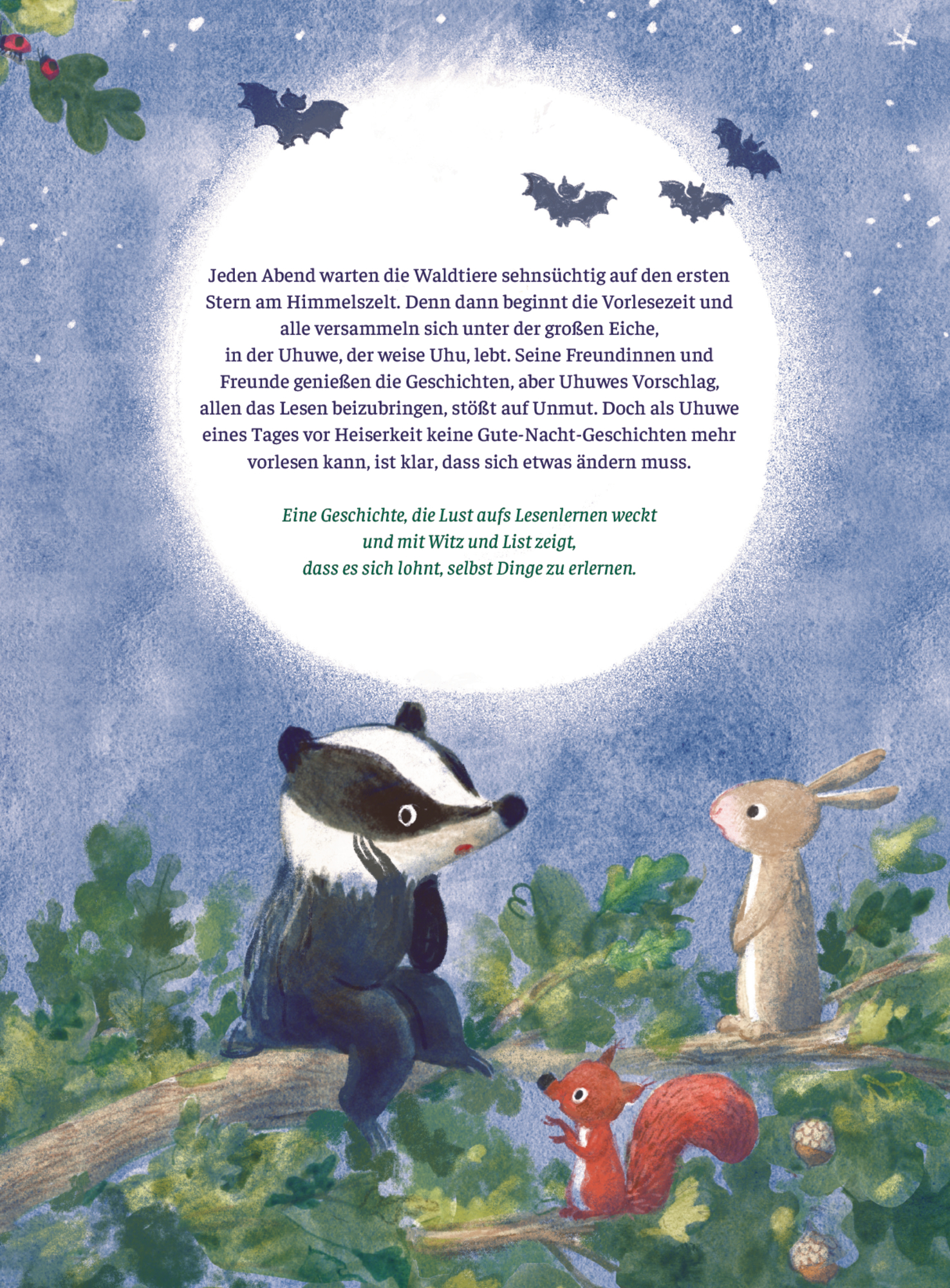 Jeden Abend warten die Waldtiere sehnsüchtig auf den ersten Stern am Himmelszelt. Denn dann beginnt die Vorlesezeit und alle versammeln sich unter der großen Eiche, in der Uhuwe, der weise Uhu, lebt. Seine Freunde und Freundinnen genießen die Geschichten, aber Uhuwes Vorschlag, allen das Lesen beizubringen, stößt auf Unmut. Wie schön ist es doch, wenn einem vorgelesen wird? Und wozu etwas lernen, was ein anderer bereits kann?